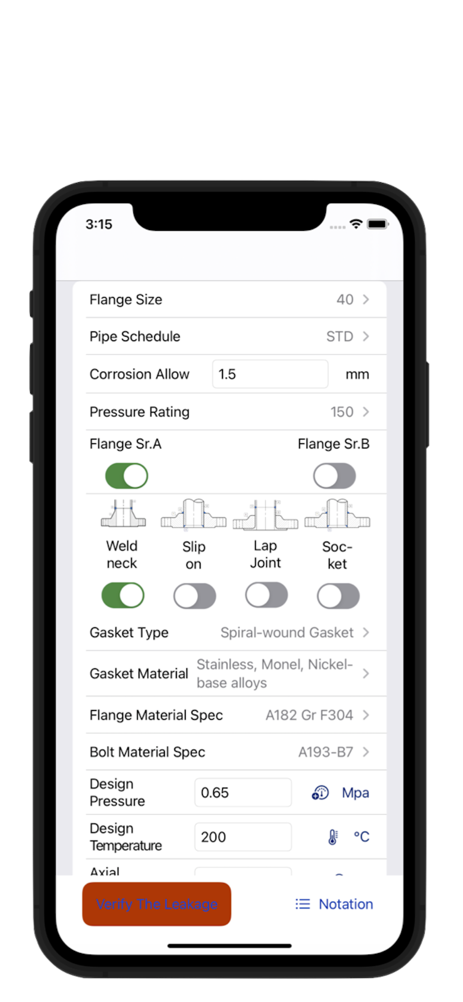 A tool for flange leakage checking for ASME flange B16.5, B16.47. Judgement criteria is based on ASME section VII div.1 Appendix 2. This tool utilize ASME section VIII div1 Appendix 2 method in combination with the pressure equivalent method to take into account of the external axial force and bending moment to verify the leakage of the flange joint.