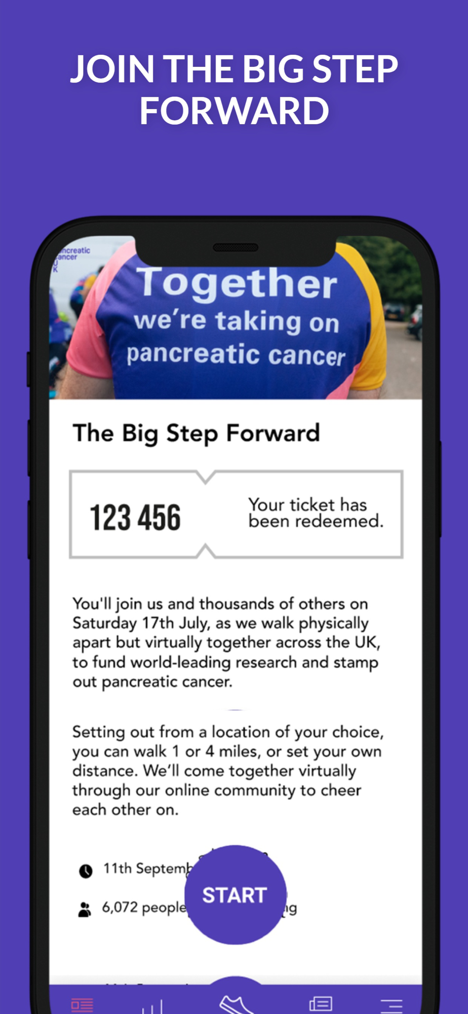 We’ve created a Big Step Forward app to help you track your walk and enable you to connect to others who, just like you, are taking steps to save lives. We invite you to join our interactive walking experience, so that wherever you are in UK or even the world, you’ll feel connected to others and have the excitement of a live event, without needing to gather in large groups.