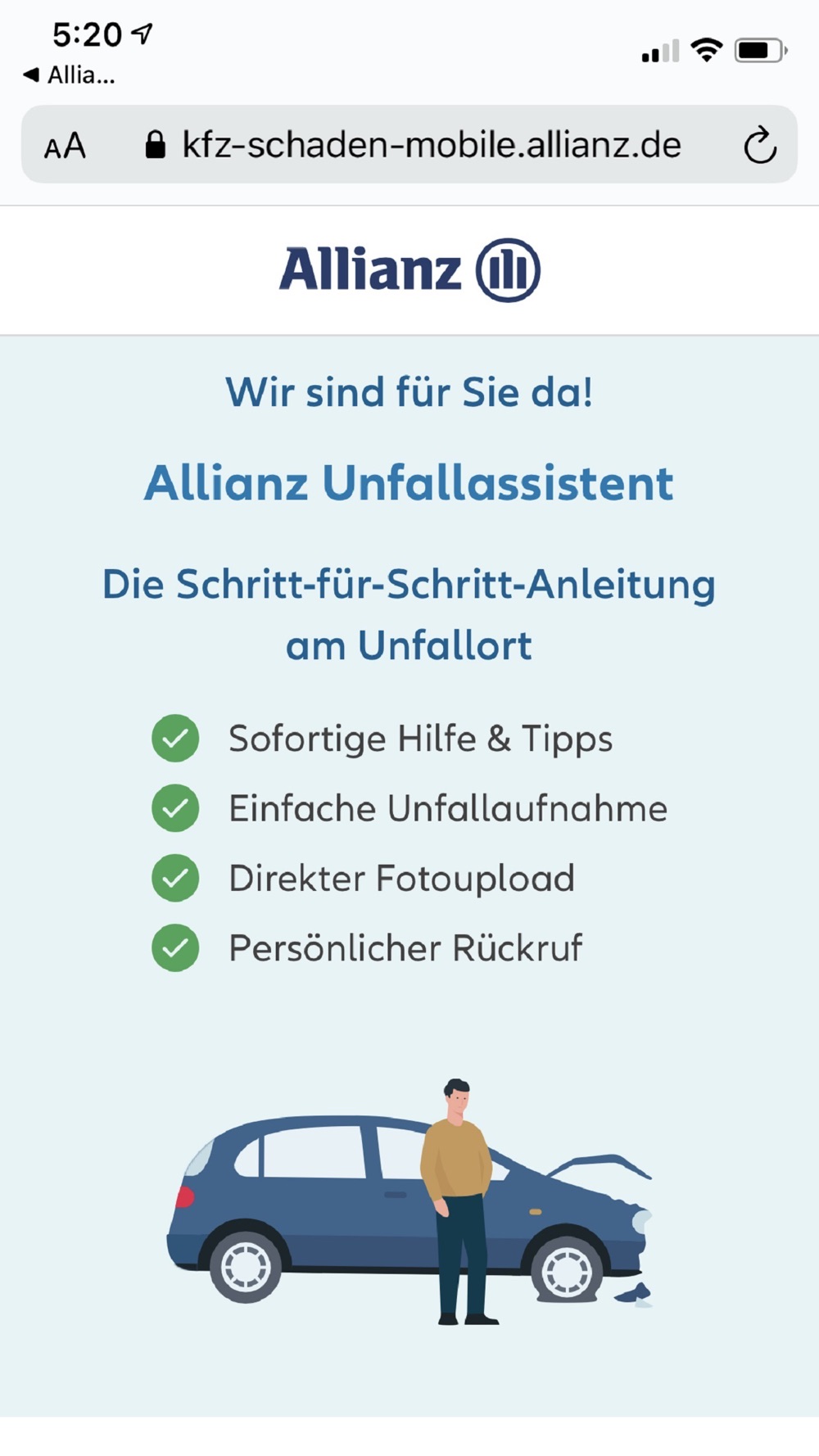 Egal, ob Auffahrunfall oder Zusammenstoß auf dem Supermarktparkplatz: der Allianz Unfallmelder erkennt einen Unfall und bietet schnelle sowie unkomplizierte Hilfe im Schadenfall. Sie erhalten wichtige Verhaltenstipps direkt am Unfallort und Unterstützung bei der Organisation beispielsweise eines Abschleppwagens, Mietwagens oder anderer hilfreicher Services sowie der zügigen Schadenregulierung. Darüber hinaus können Sie ein Fahrtenbuch führen und spielerisch ihr Fahrverhalten verbessern. Für die Nutzung muss für Ihr Fahrzeug bei der Allianz versichert sein.