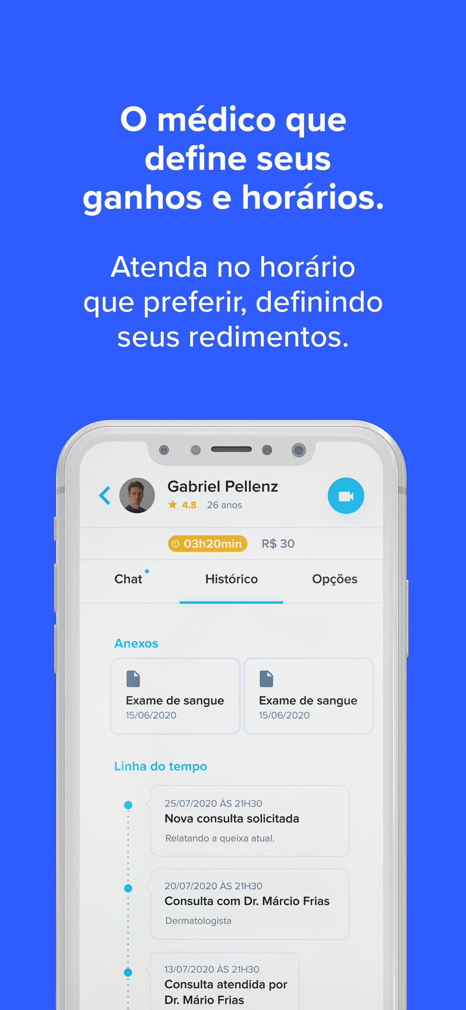 Basta o médico se conectar, escolher o paciente e começar a consulta via chat, prescrevendo medicamentos, exames e atestados dentro do próprio app, de qualquer lugar e a qualquer hora!