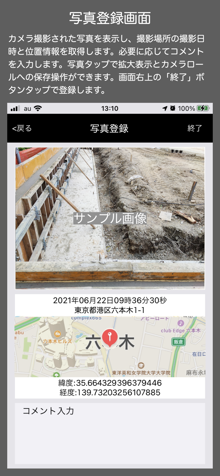 2.現場でカメラ撮影を行い(*1)、必要に応じてコメントを入力して保存(撮影日時と場所はGPSにより自動的に保存されます)