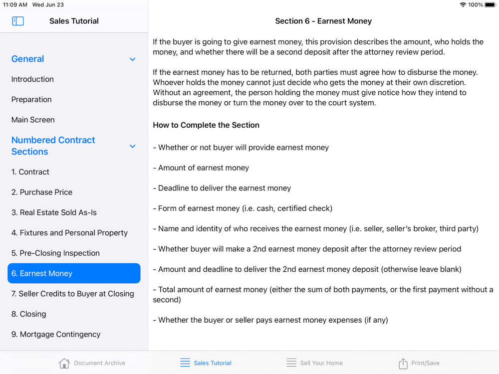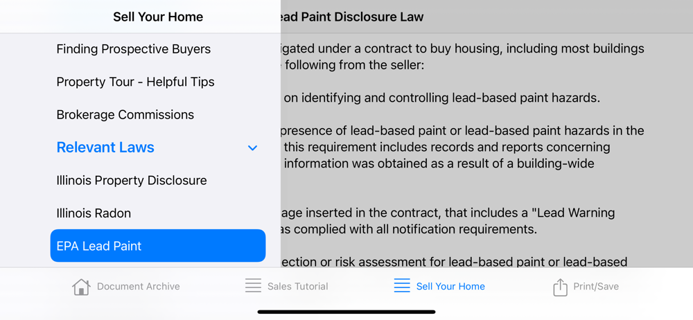 iOS Version: The app has four screens (tabs) to flip between content. The first is a document archive. The second is a complete tutorial for the documents. The third provides an explanation with helpful tips to guide the user through the transaction from start to finish. The fourth allows the user to print or save the files.