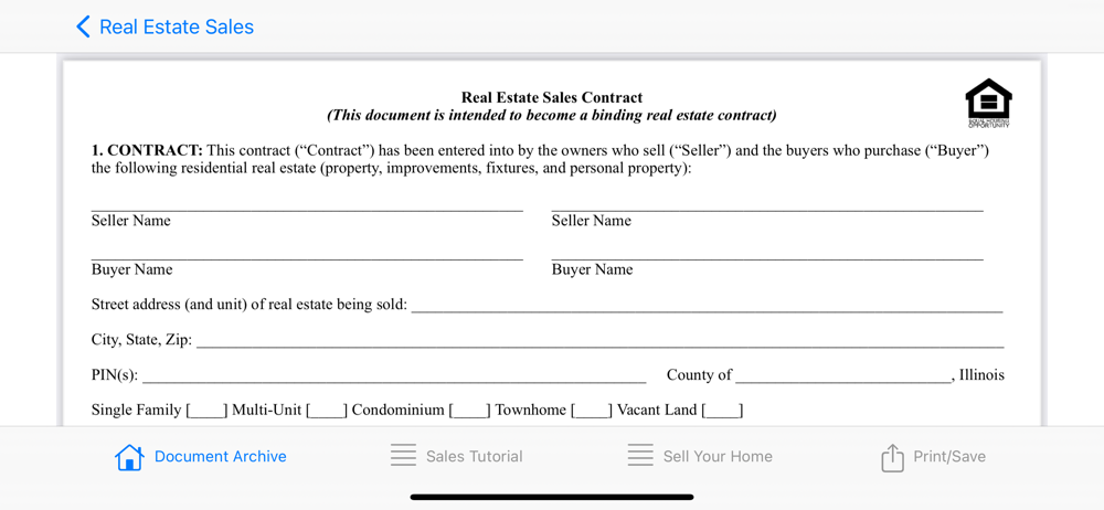 Disclaimer: This app is only intended for real estate located in Illinois. The intended audience are users who want to sell their residential property without a broker and are willing to research and learn about the process on their own using this app as a guide to get started. The sales contract was written for broad coverage, but may require customization for full satisfaction of the user's personal preferences.