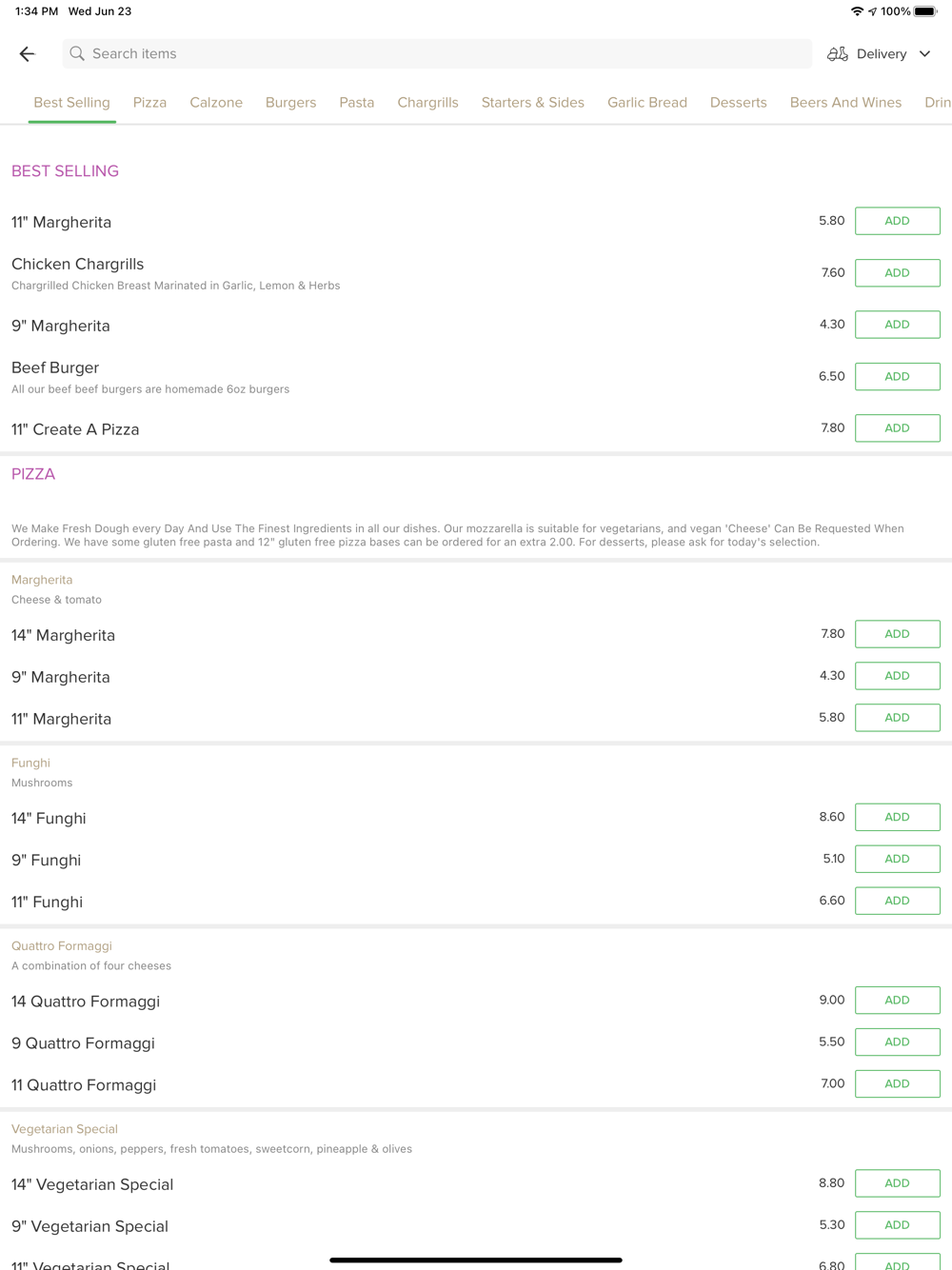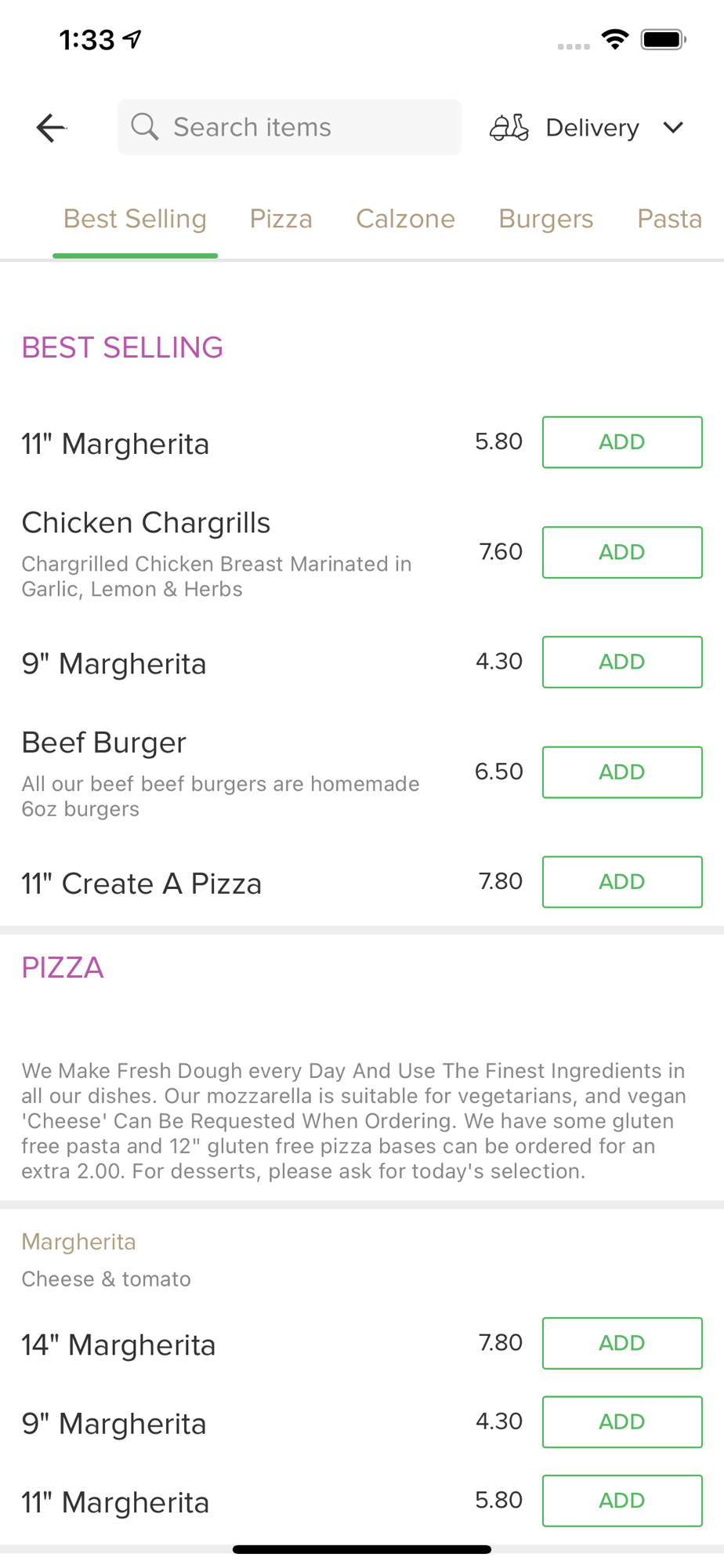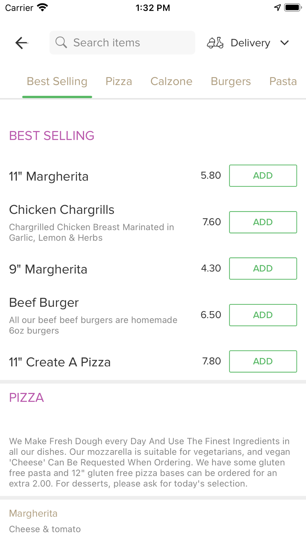 Freshly made dough, hand stretched & stone baked available in crispy or thick bases, a range of sizes or folded calzone.
