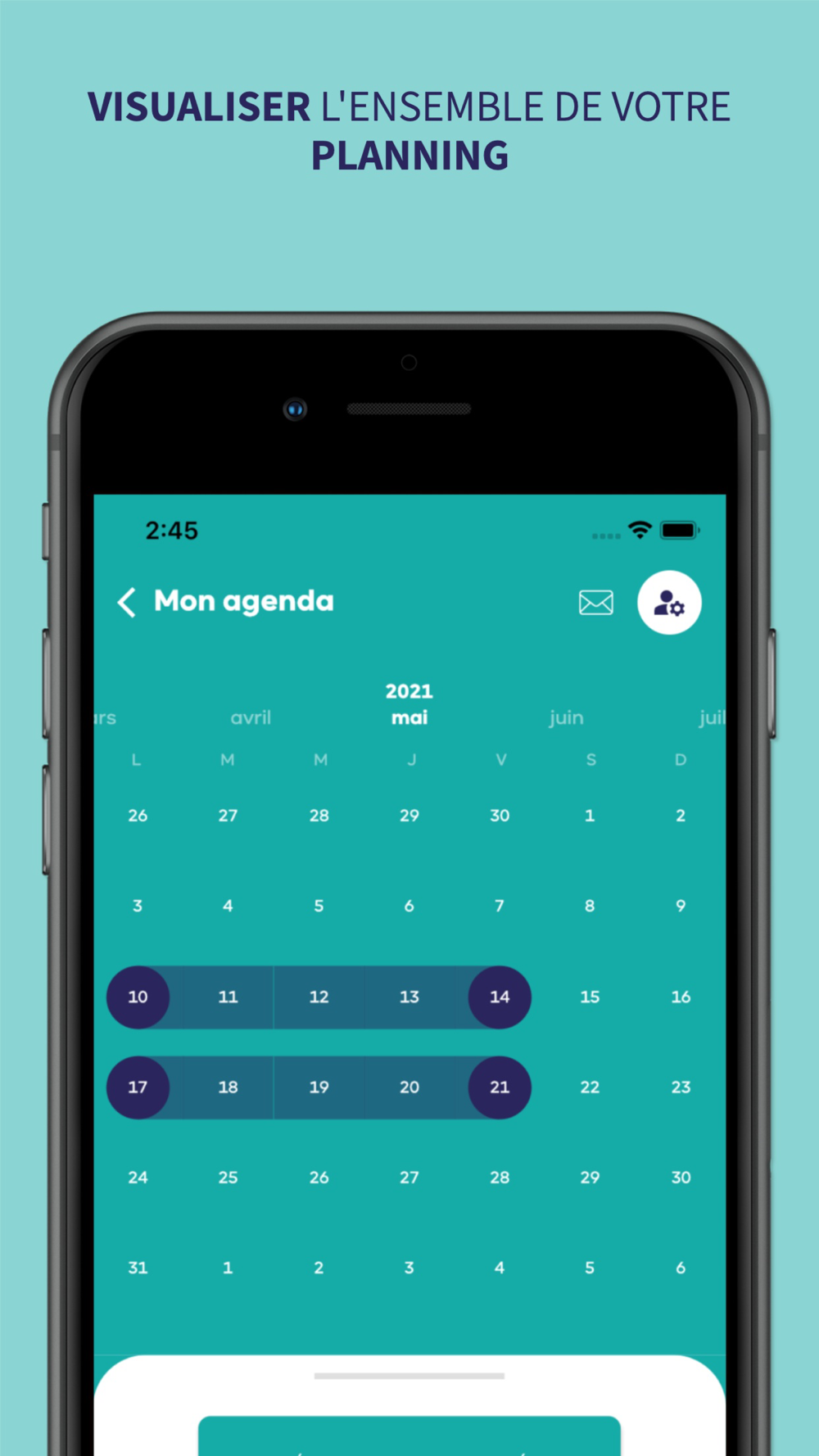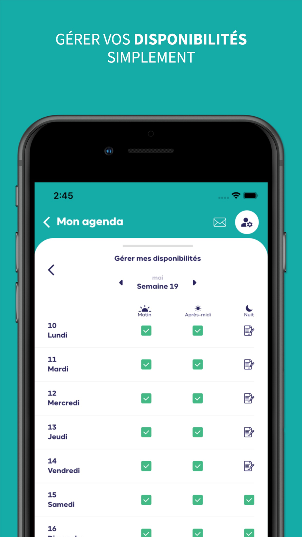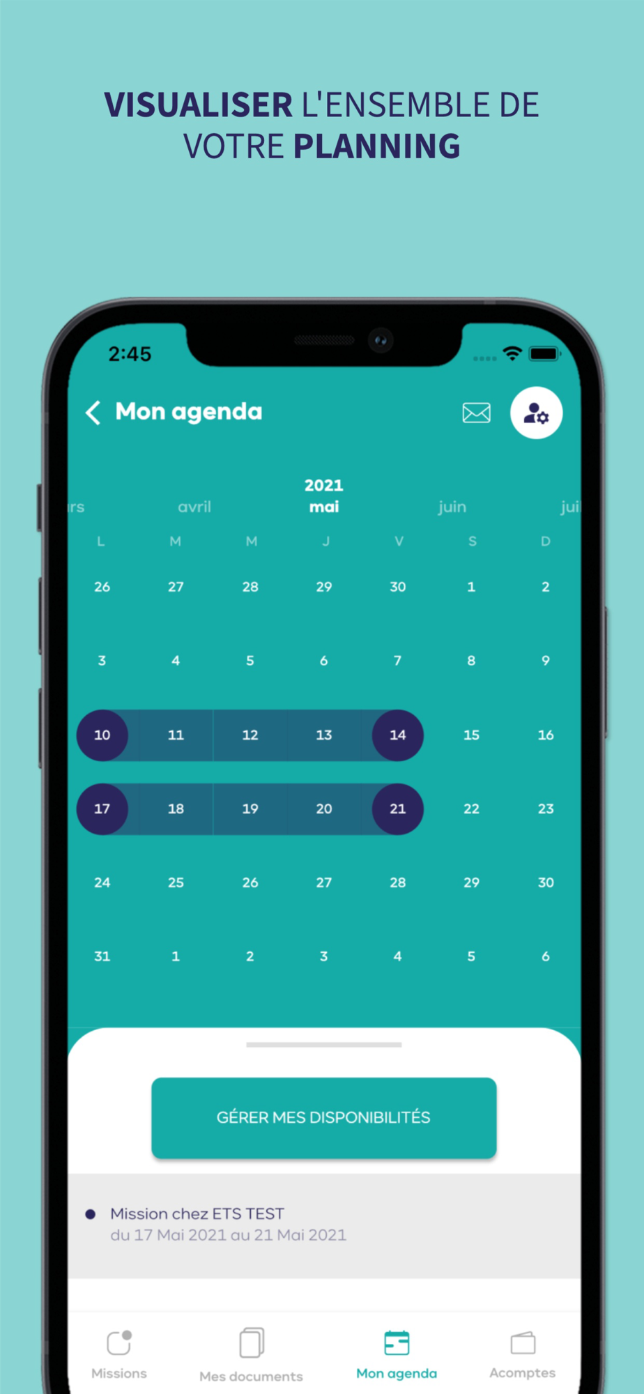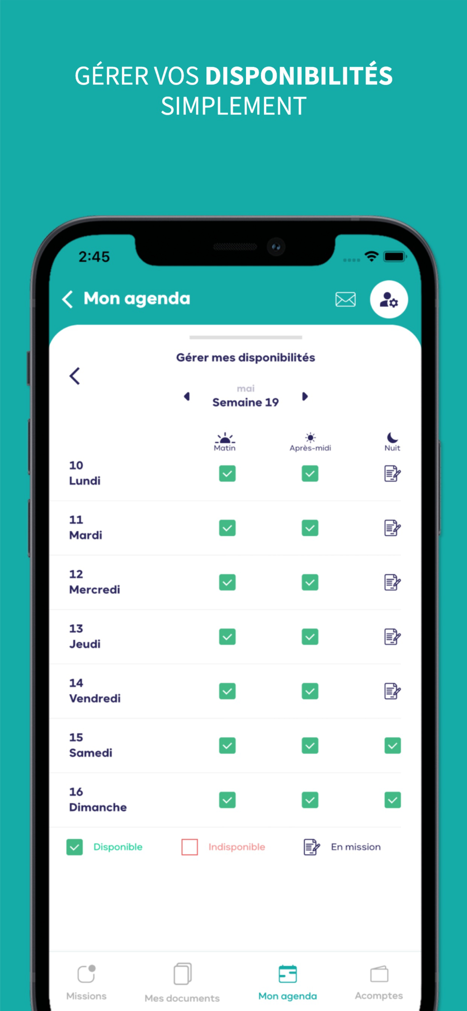 • Retrouver l'ensemble des missions qui vous sont confiées dans votre planning, indiquer vos disponibilités ou indisponibilités,