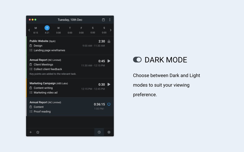 Avaza Timesheets Desktop app brings time tracking right onto your desktop. You can start and stop a timer from the menu bar, perform common functions with keyboard shortcuts, switch between light and dark mode, save time by creating timesheets from your frequently used favourite timesheets and more.