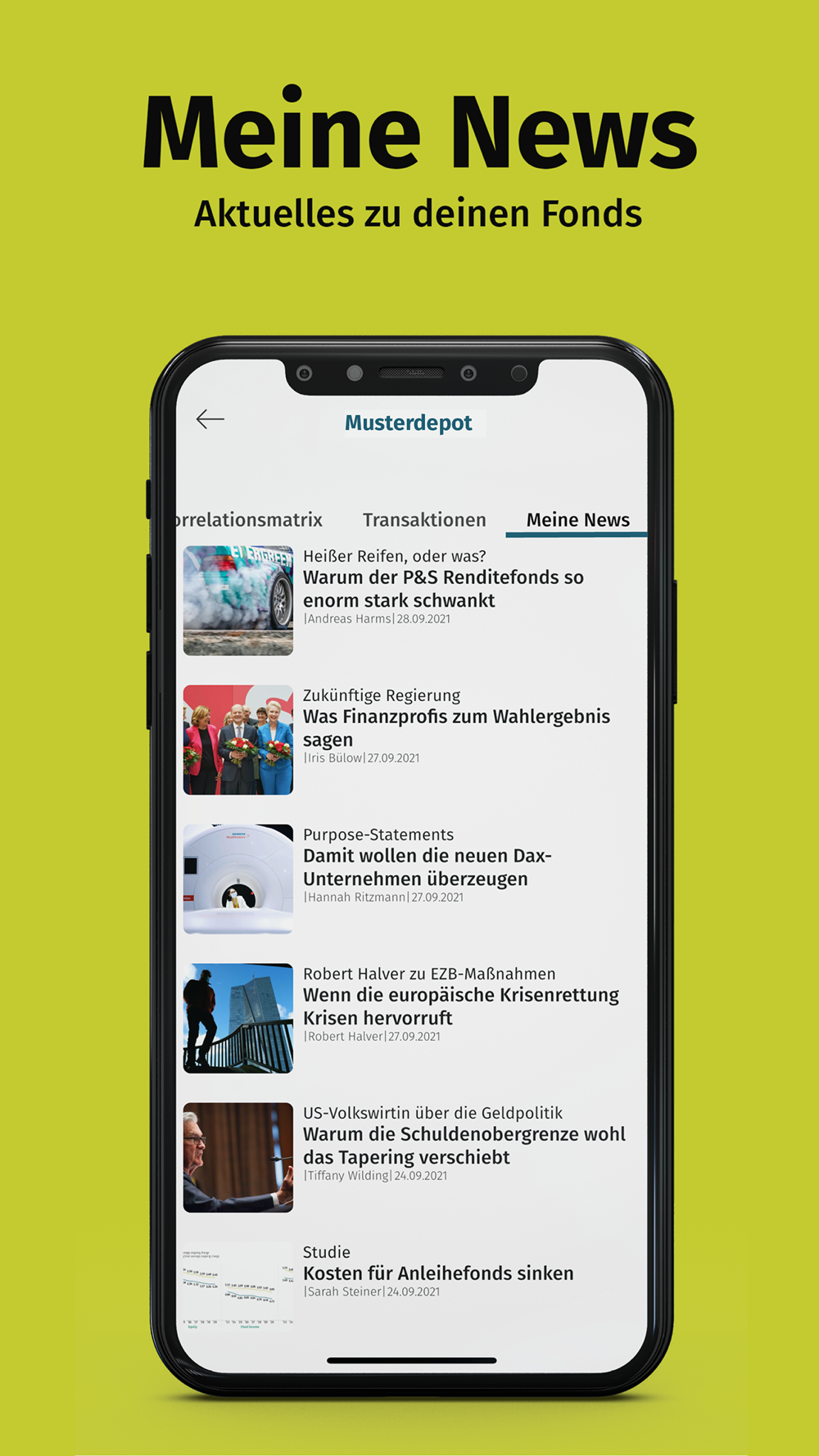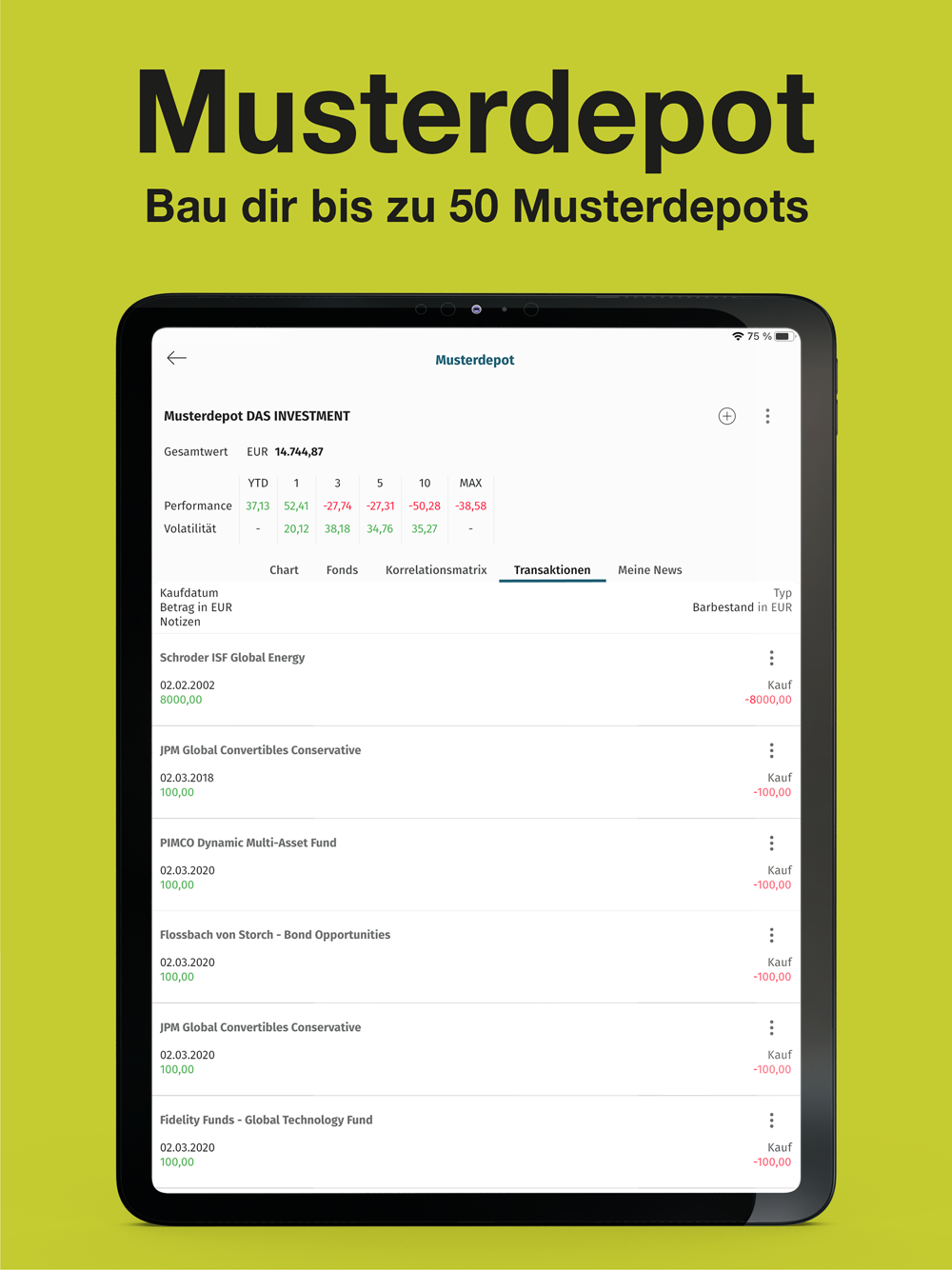 MUSTERDEPOT: Verwalte dein virtuelles Musterdepot, um deine Anlagestrategien zu testen und mögliche Gewinne und Verluste zu verfolgen. Beobachte die Performance deiner ausgewählten Fonds und ETFs.