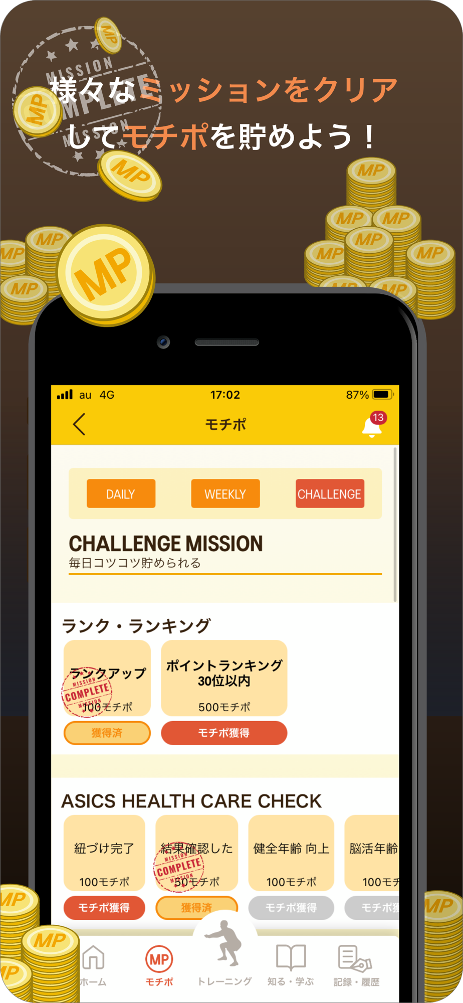 日や週ごとに設定されたミッションを毎日コツコツすることでトレーニングを習慣化できあなたの健康改善が加速します。