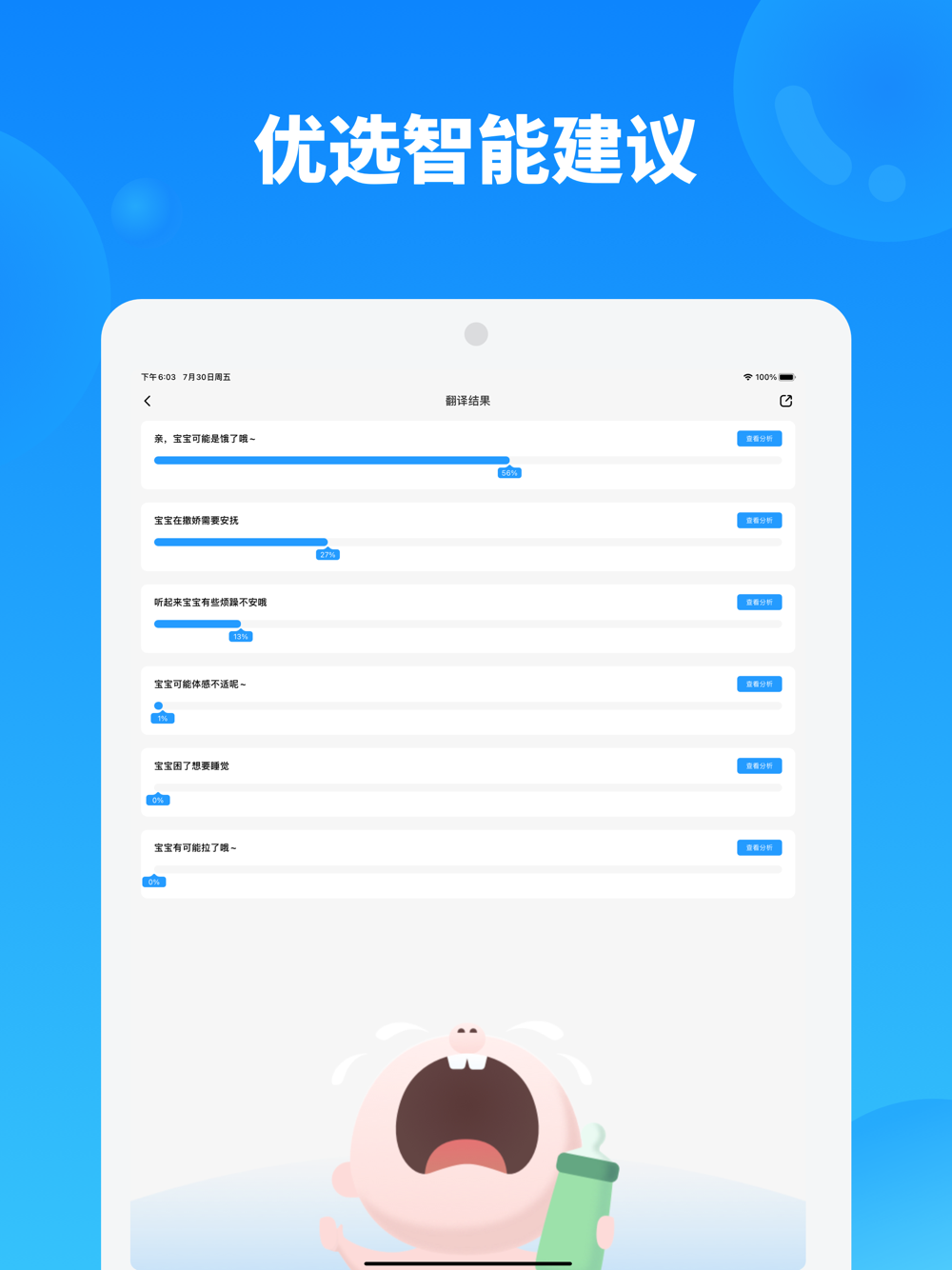 我们经大量的数据分析,通过宝宝的哭声特性,根据我们的智能算法分析宝宝哭闹原因,为初为父母的你们提供更加可靠的育儿建议,宝宝哭闹再也不怕不怕啦。