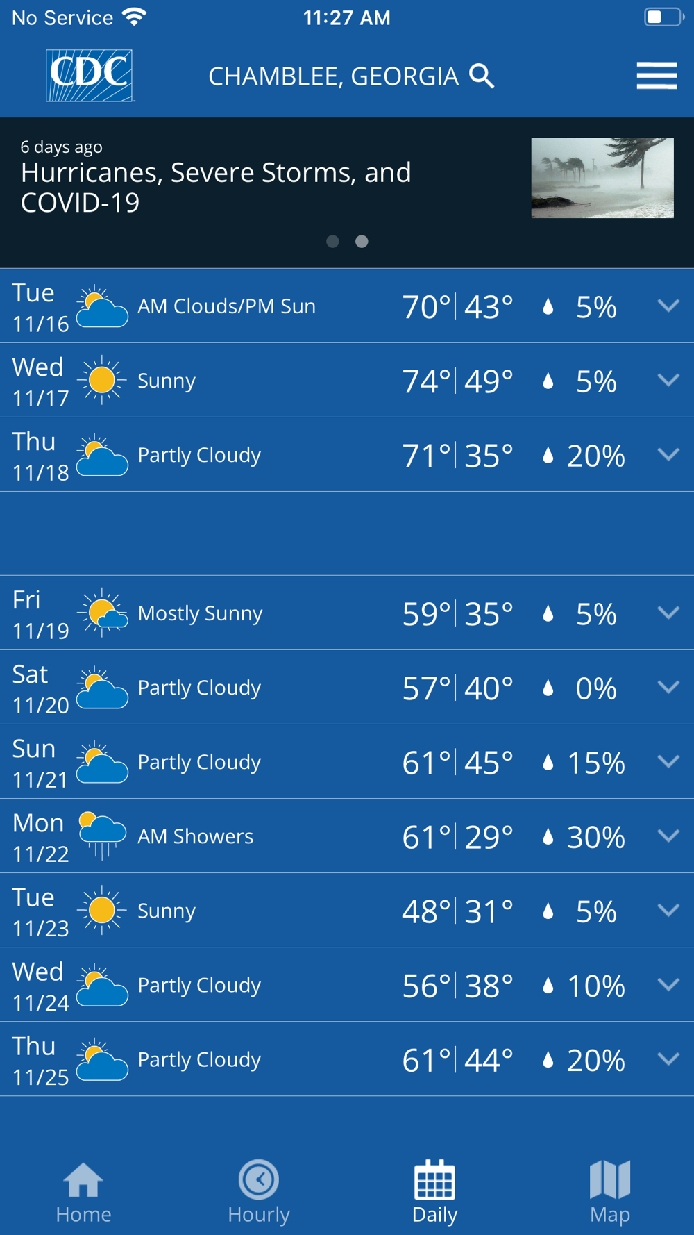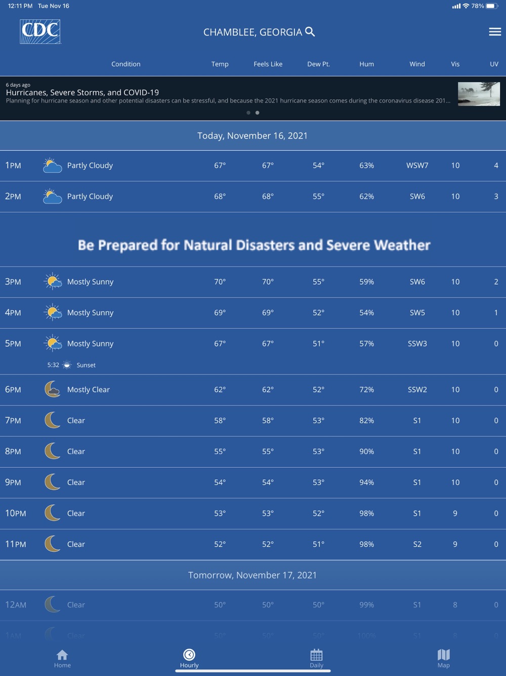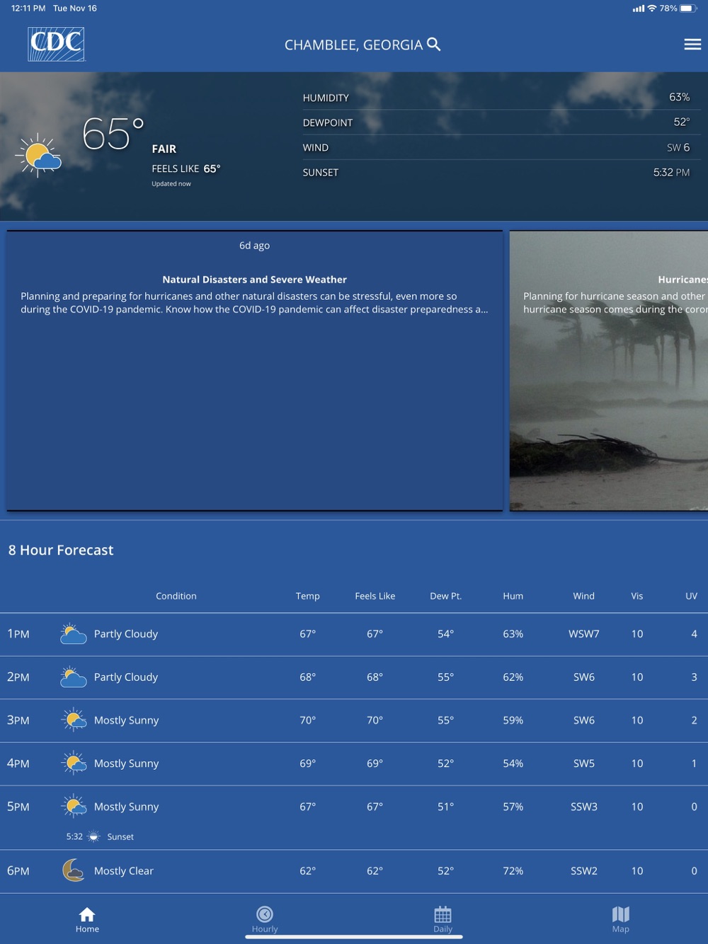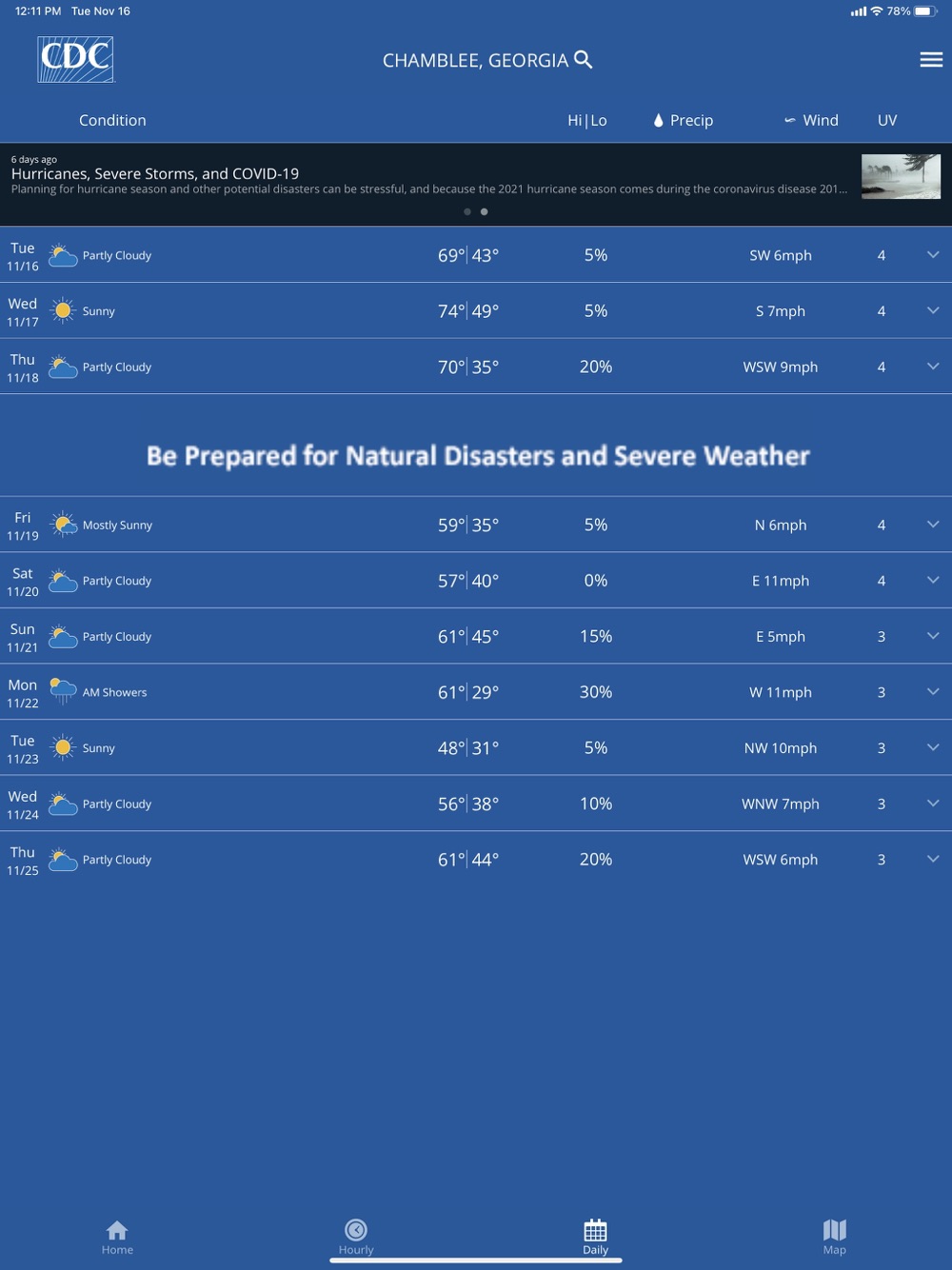 If you live in an area of the United States prone to severe weather events or if you or a loved one have health conditions triggered by weather conditions, staying up to date on the latest weather can help you stay healthy and safe no matter where you are in the country. View daily and weekly localized forecasts, check live radar and receive seasonal extreme weather and hazardous exposure guidance from the CDC for events occurring in your area. With a wide range of features available, the CDC’s My Health Day mobile app can help you prepare with confidence.