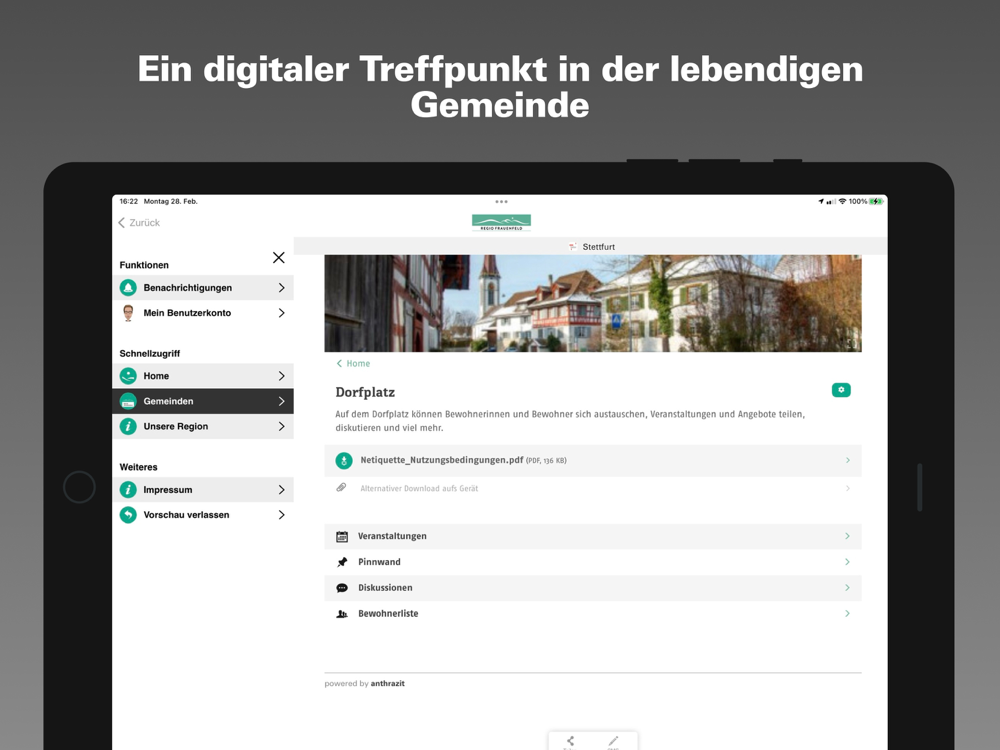 Mit wichtigen Gemeinde-Informationen wie News, Events, Abstimmungen, Abfallkalender, und einer Meldefunktion für Schadensfälle.