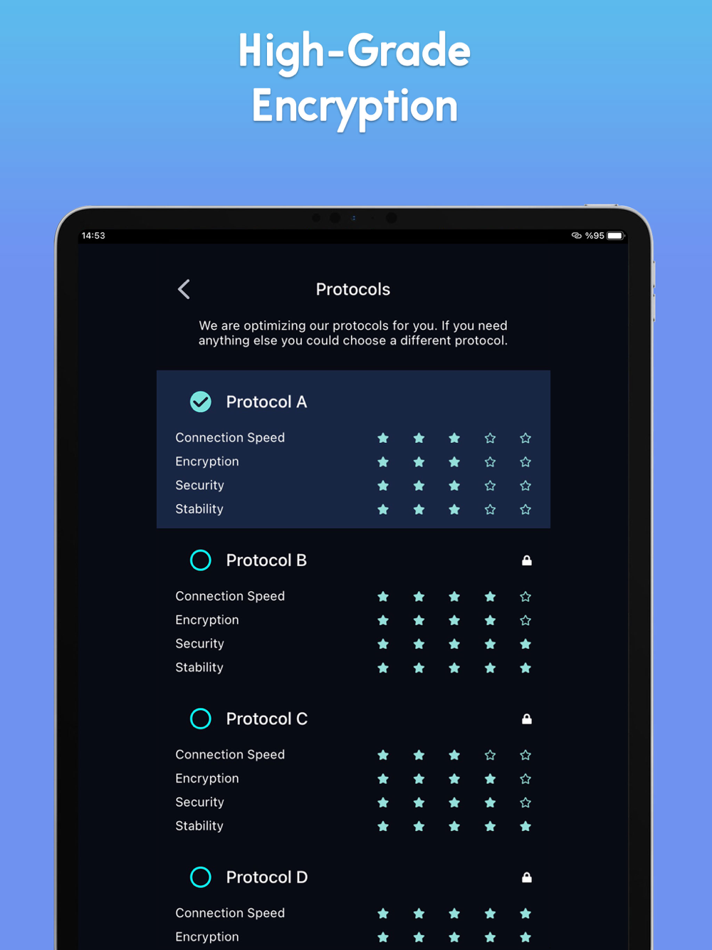 Stay connected with military-grade encryption, and choose the best protocol regarding your needs.