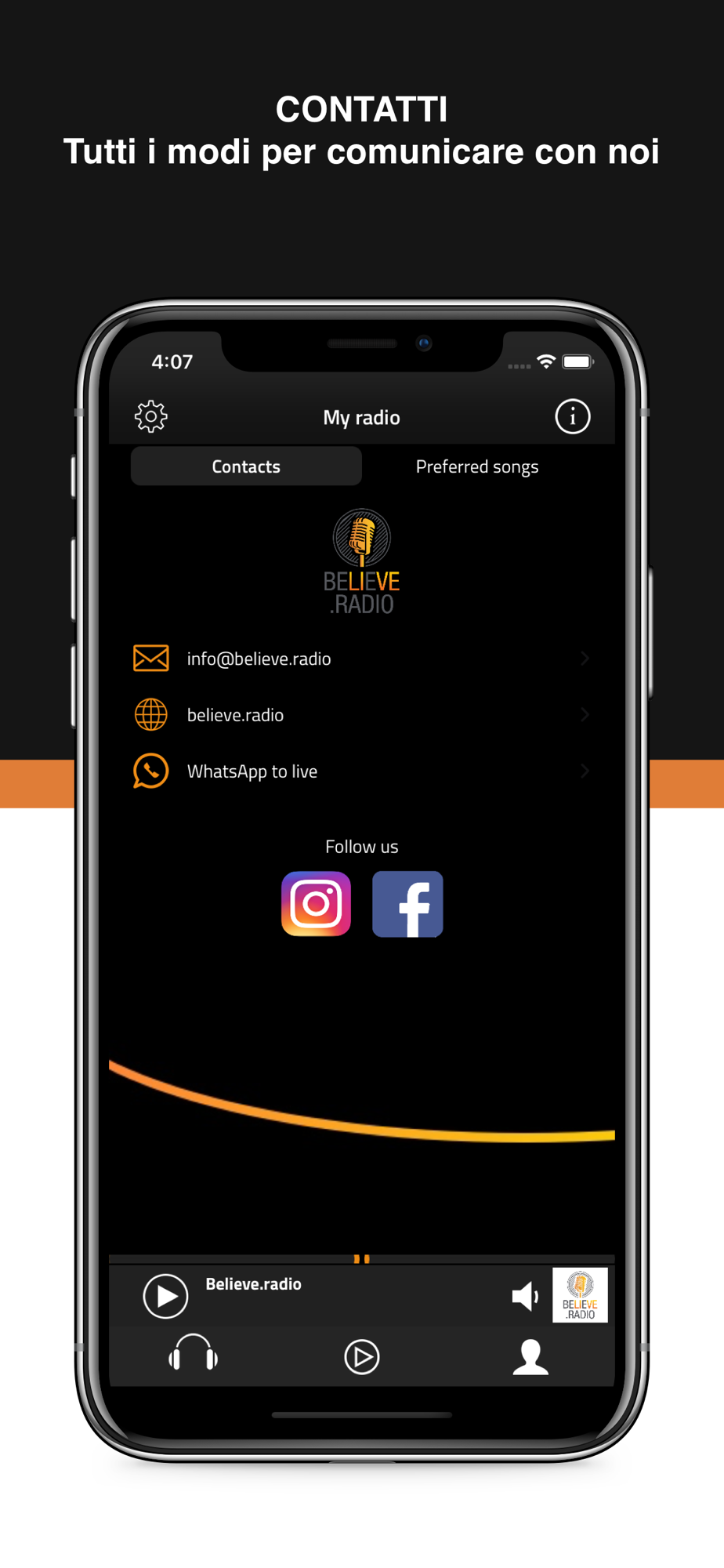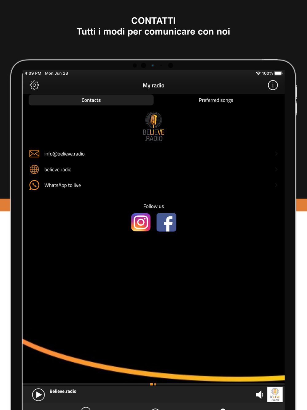 Nell'app troverai anche i nostri contatti se vorrai entrare a far parte del nostro progetto radiofonico: Believe.radio simply young ideas!