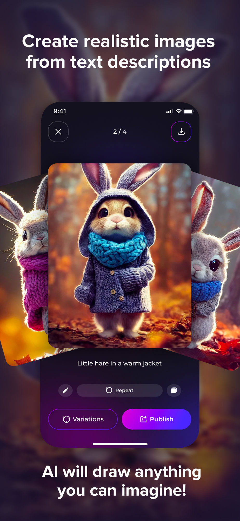 Our latest update has also brought in a new functionality for creating variations of art. You can use your own photos or images generated within the app to create unique variations of art. With Magicly, you can generate spectacular artwork from words using the latest AI technology, all at the click of a button. Just enter a text prompt and let Magicly produce an image that's entirely new and astonishingly beautiful. Produce stunning, original works of art with AI and your imagination.