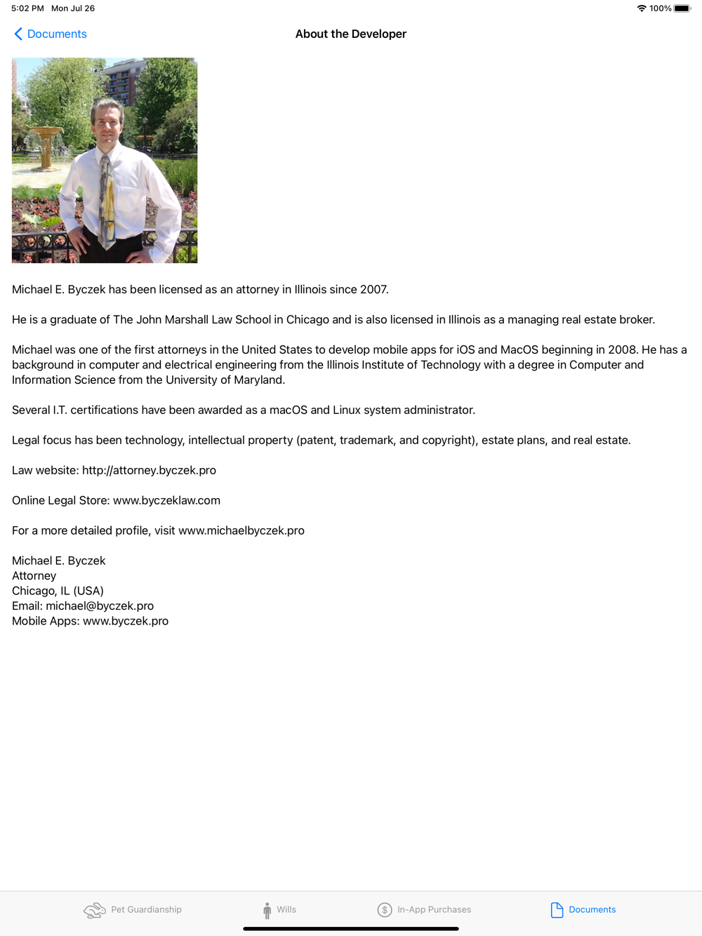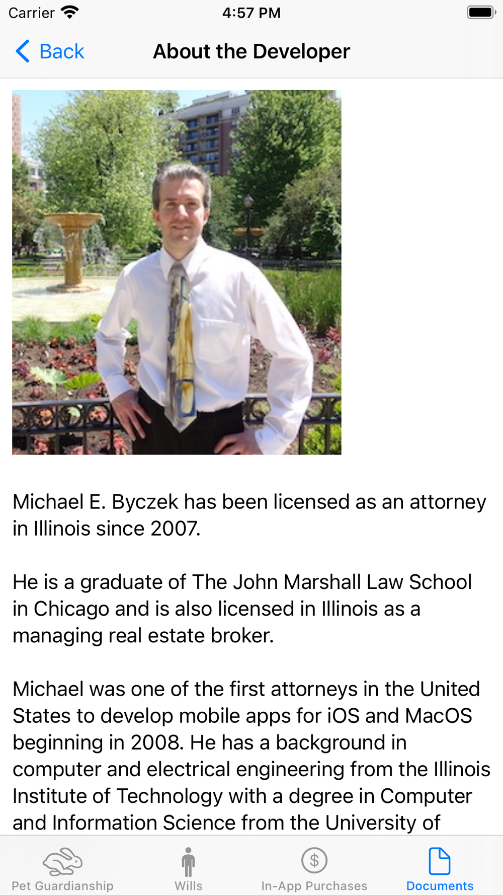 The developer, Michael E. Byczek, is a licensed Illinois attorney with a background in computer engineering. He was one of the first attorneys in the United States to develop legal apps for iOS and macOS beginning in 2008 focusing on PDF legal documents and analysis of intellectual property law.