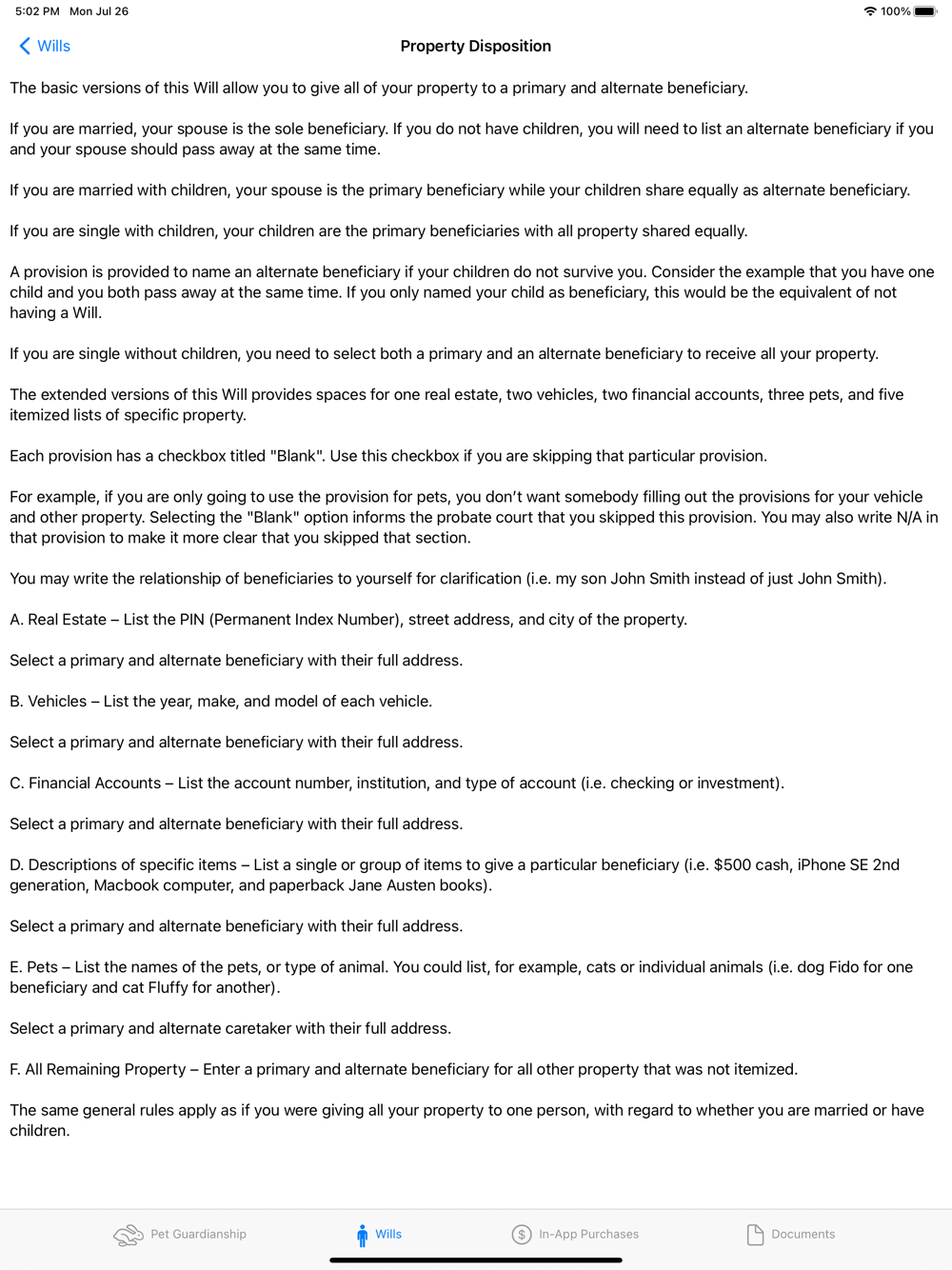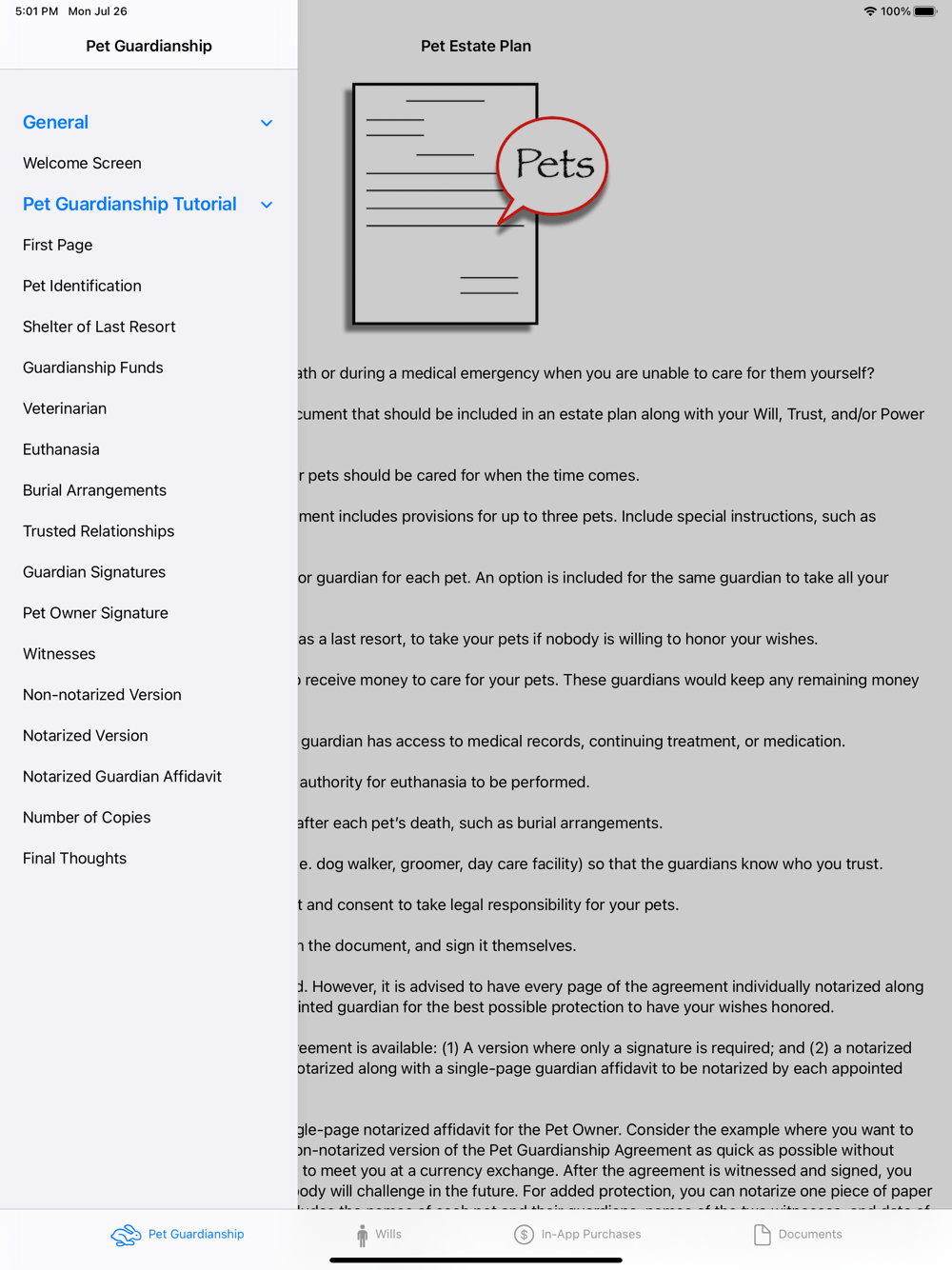 Disclaimer: This app is intended for residents in Illinois to write an estate plan. The documents are Illinois-specific. Any user may use the app for information to understand the legal requirements of a pet guardianship agreement and Will.