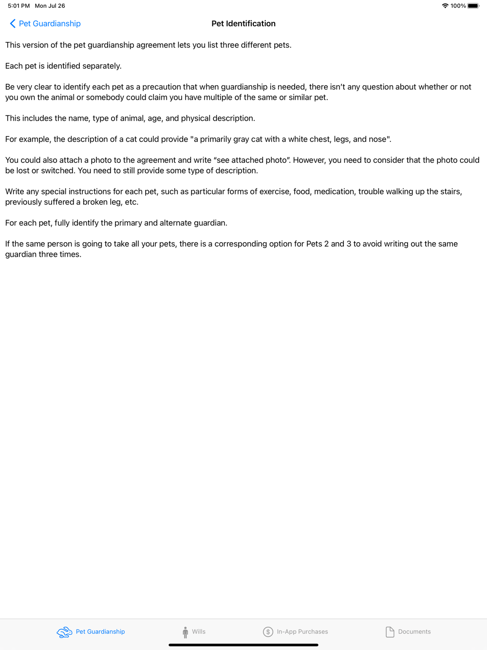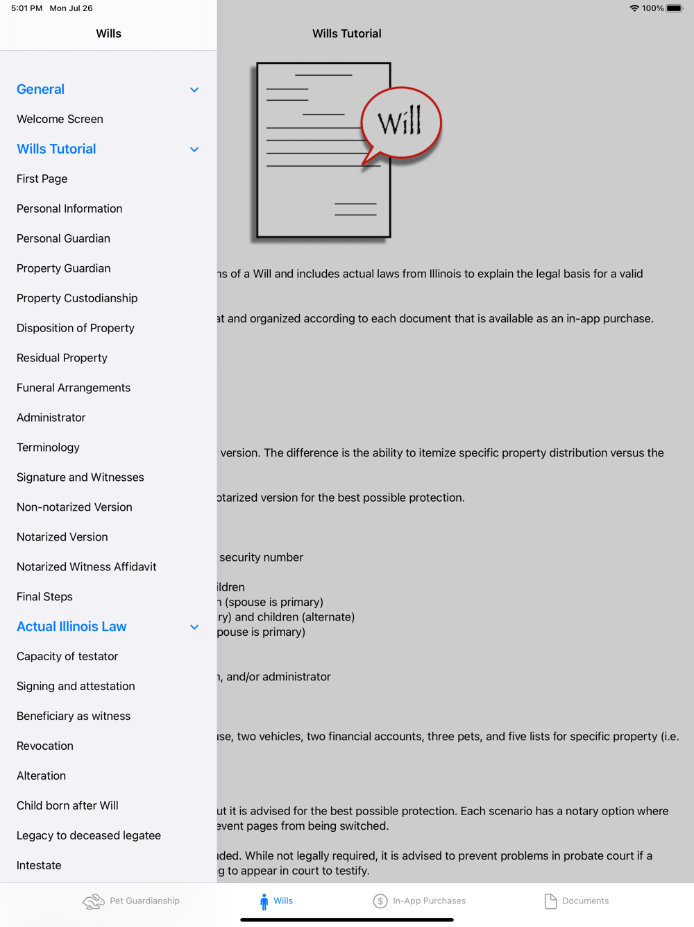 The free version of this app provides a tutorial about how to complete both a pet guardianship agreement for animals and Will for yourself. The tutorial fully explains each provision of these documents from an informational perspective. Actual Illinois laws are included for users to learn about the legal requirements for a Will.