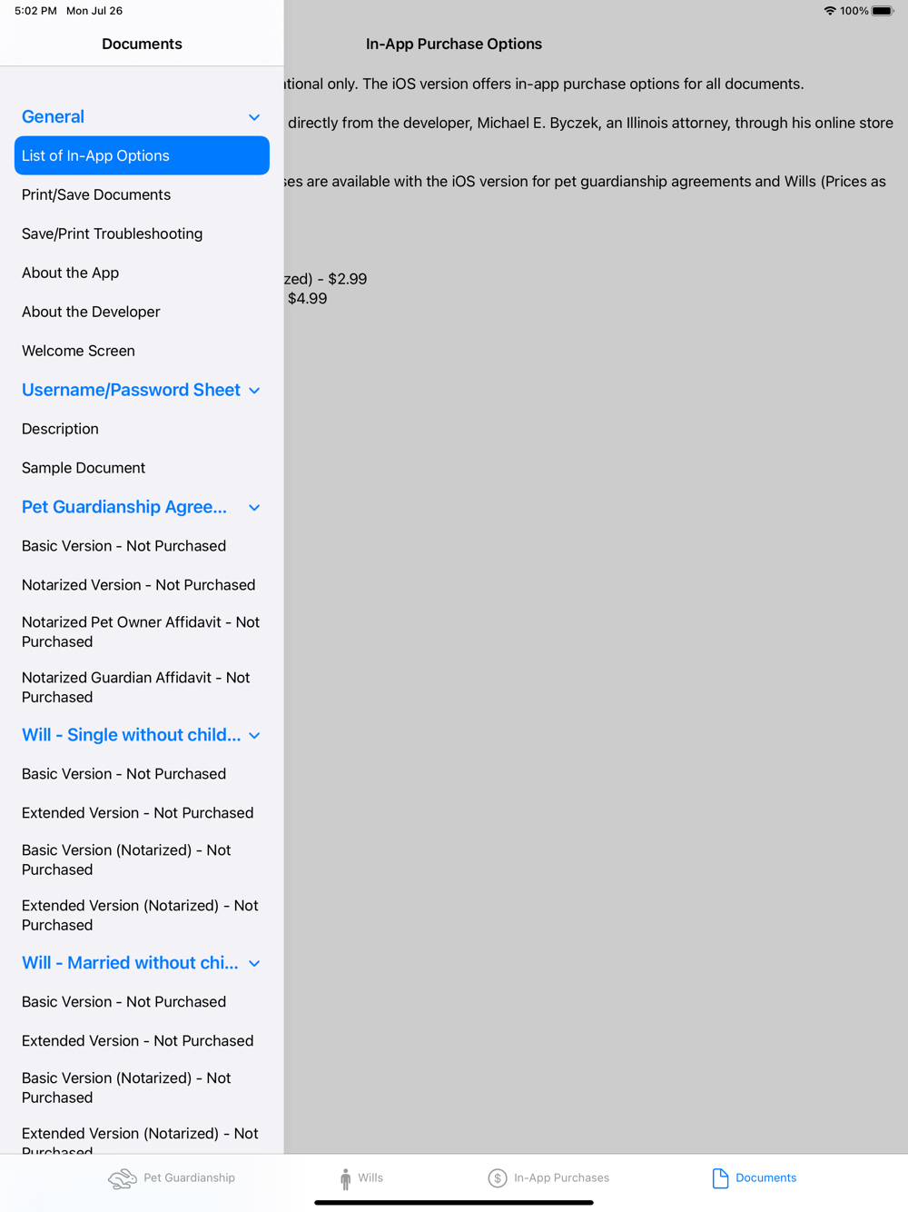 The Wills portion of the app includes the following options that range from $1.99 to $5.99 each (iOS version only).