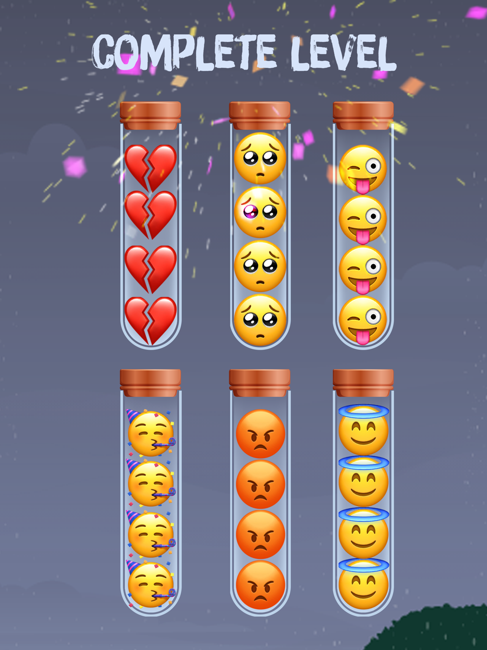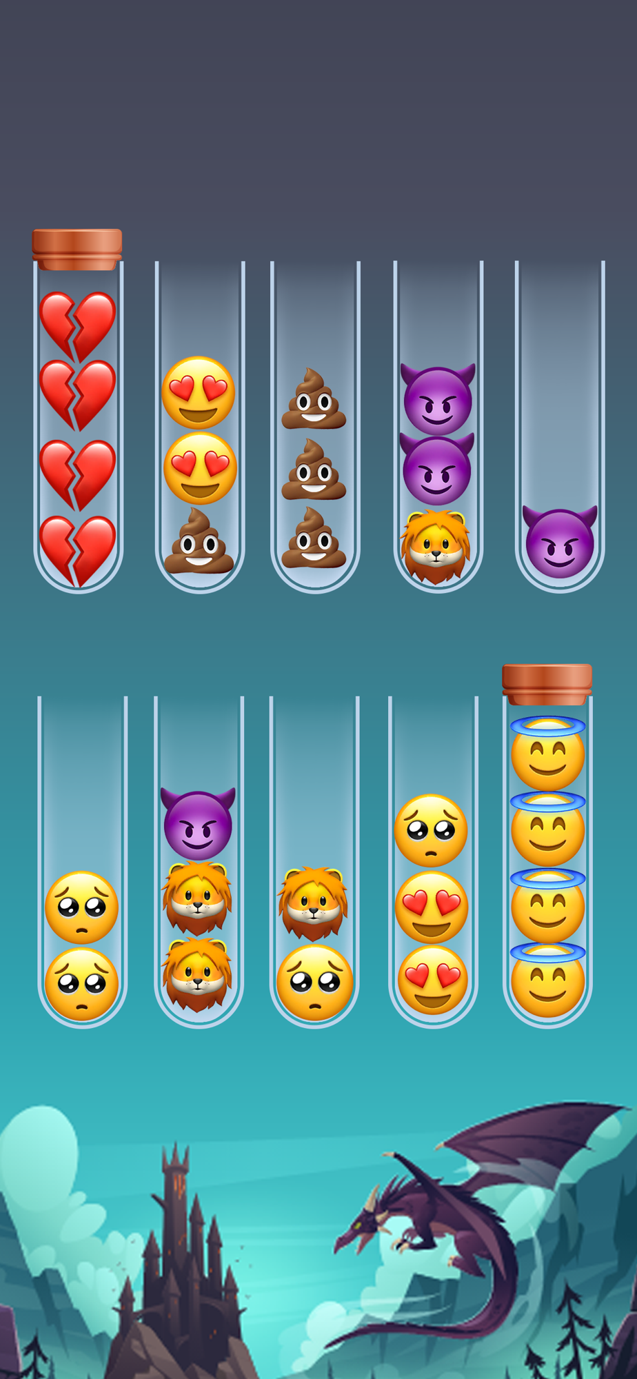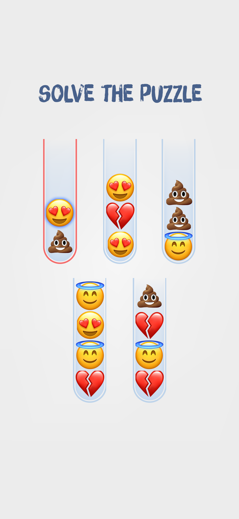 The casual Emoji sorting puzzle game is fun and challenging with a big break in the gameplay of the puzzles. Sort Emoji into glass bottles so that each bottle has the same Emoji.