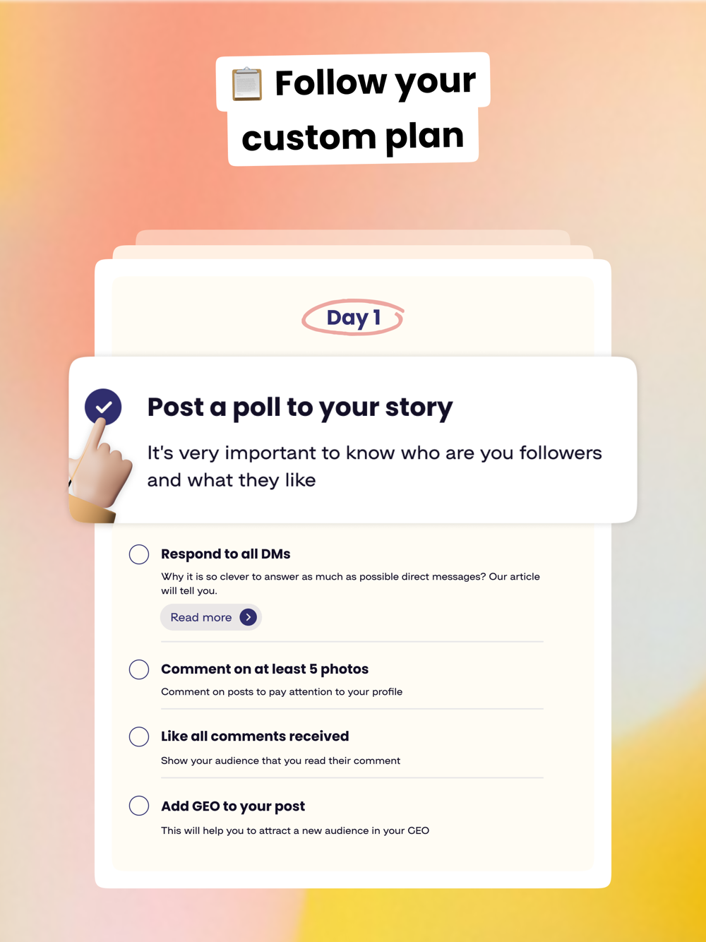 Like with any other personal trainer, with InPlan you will learn everything you need to know about growing your Instagram and put that knowledge to practice. The app will put together the perfect routine to help you achieve your goals depending on your focus and the time you have and will provide a detailed explanation of each step. Moreover, InPlan is consistently updated with new insights from latest research and major experts in the niche.