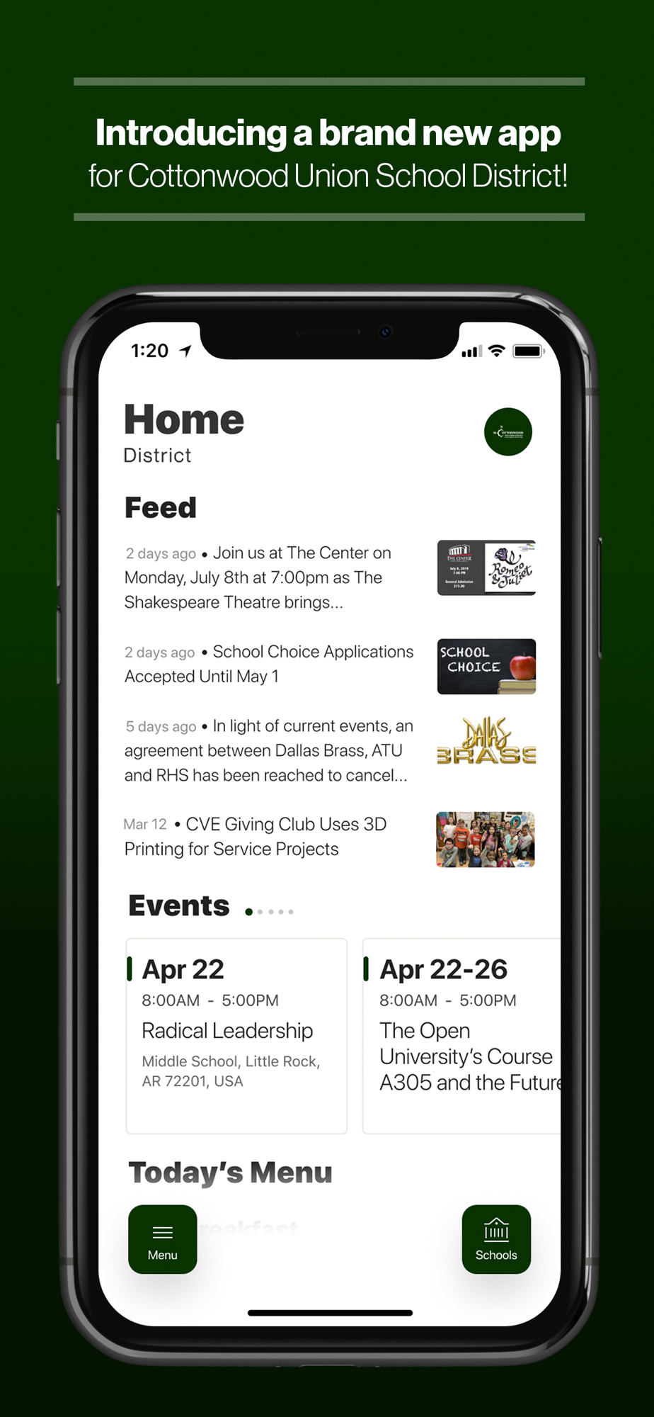 The event section shows a list of events throughout the district. Users can add an event to your calendar to share the event with friends and family with one tap.