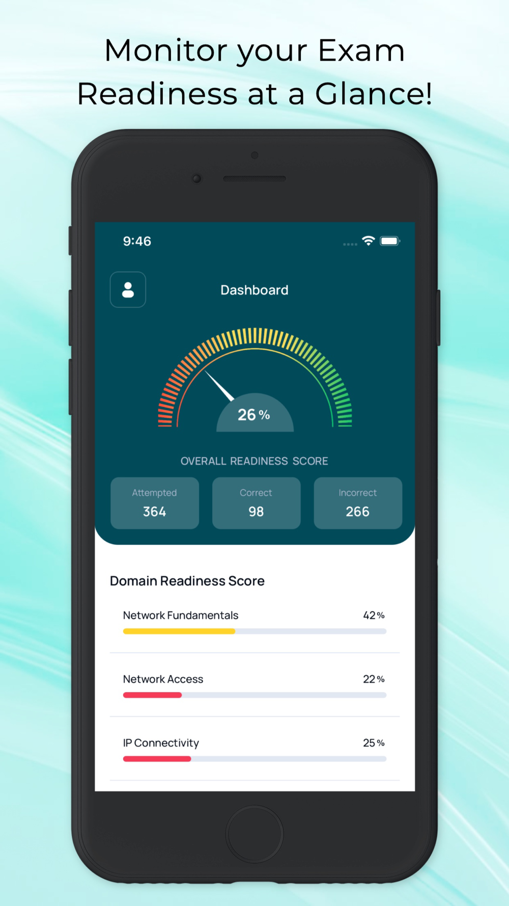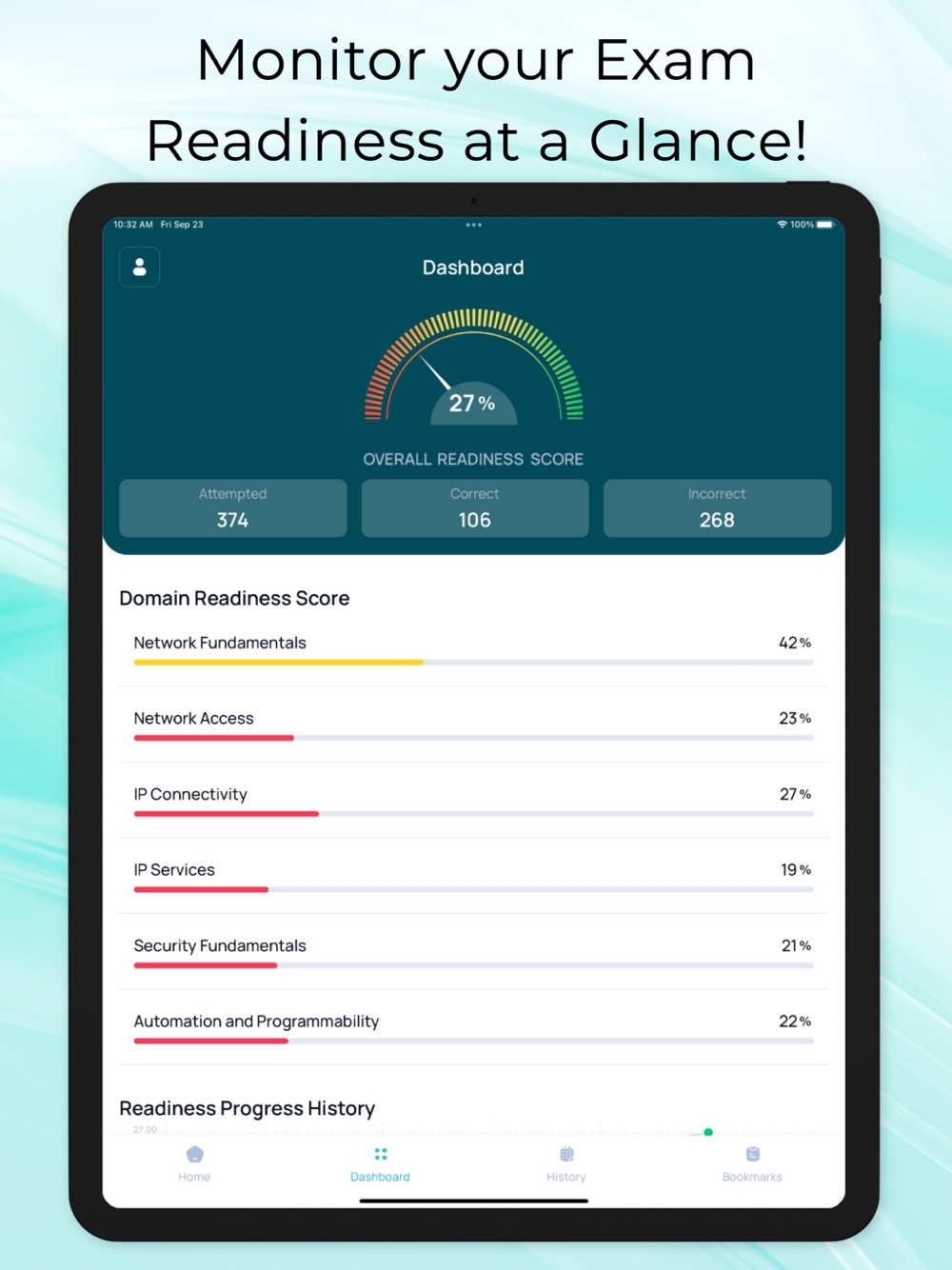 Readiness Score: Based on your performance in the practice tests, your readiness score is calculated. The overall readiness score indicates your readiness for the real test and the domain readiness score indicates your strengths and weaknesses in each domain.