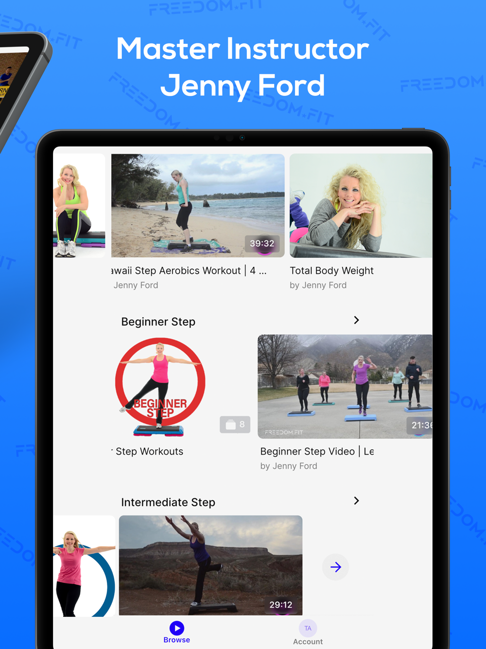 Enjoy free fitness programs and other at-home workouts with master instructor Jenny Ford. Jenny is a certified group fitness instructor who creates total body workouts that engage the whole plane of the body. Workouts are typically 30-minute cardio sessions always with options to pump up the heart rate. Step Aerobics, Barre, Yoga, Walking, Weight Trainings, Core, and more. Jenny's most loved programs Walk Across America and Step Across America can be found here.