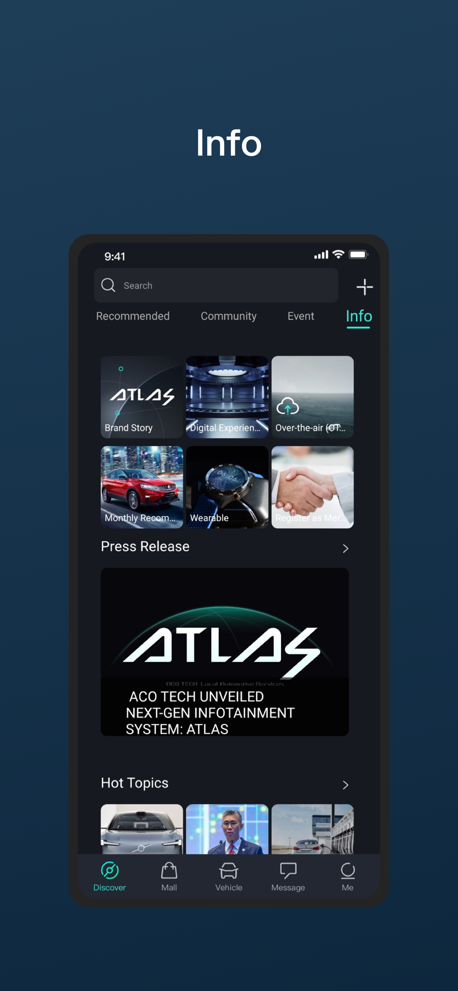 ATLAS offers significantly more than just the traditional vehicle functions of the previous app. It also provides creative and interesting features such as entertainment, social networking, brand promotion, shopping malls, e-wallet payment, and many others. Combining IHU and the cloud platform, it provides a full-scene vehicle experience and comprehensive services.
