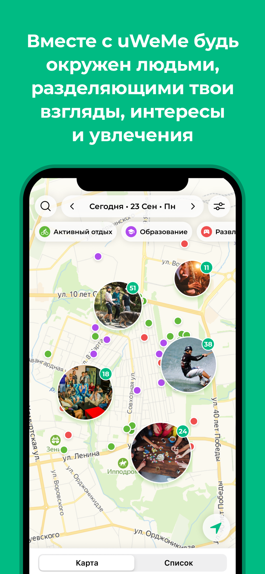 Собираетесь найти компанию для велосипедной прогулки по парку, похода на концерт или каток, хотите побеседовать на профессиональные темы за чашкой кофе или собрать большую тусовку? С uWeMe вы сможете наладить новые социальные контакты наиболее быстрым и технологичным способом, а также расширите круг общения в реальной жизни на основе общих интересов и потребностей.