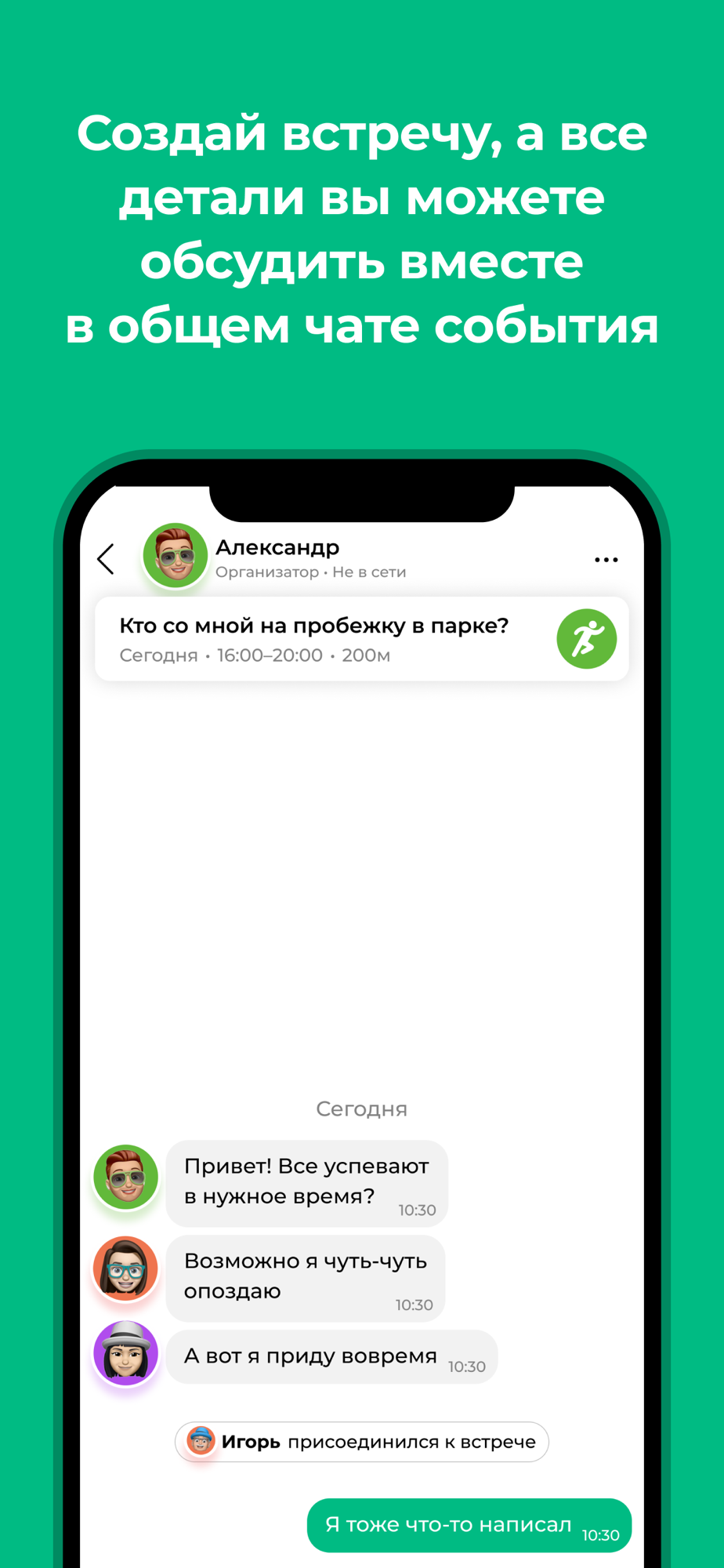 Создавайте события, посещайте мероприятия других пользователей, общайтесь в групповых и индивидуальных чатах, находите новые интересные контакты для вашей активной и разнообразной жизни.