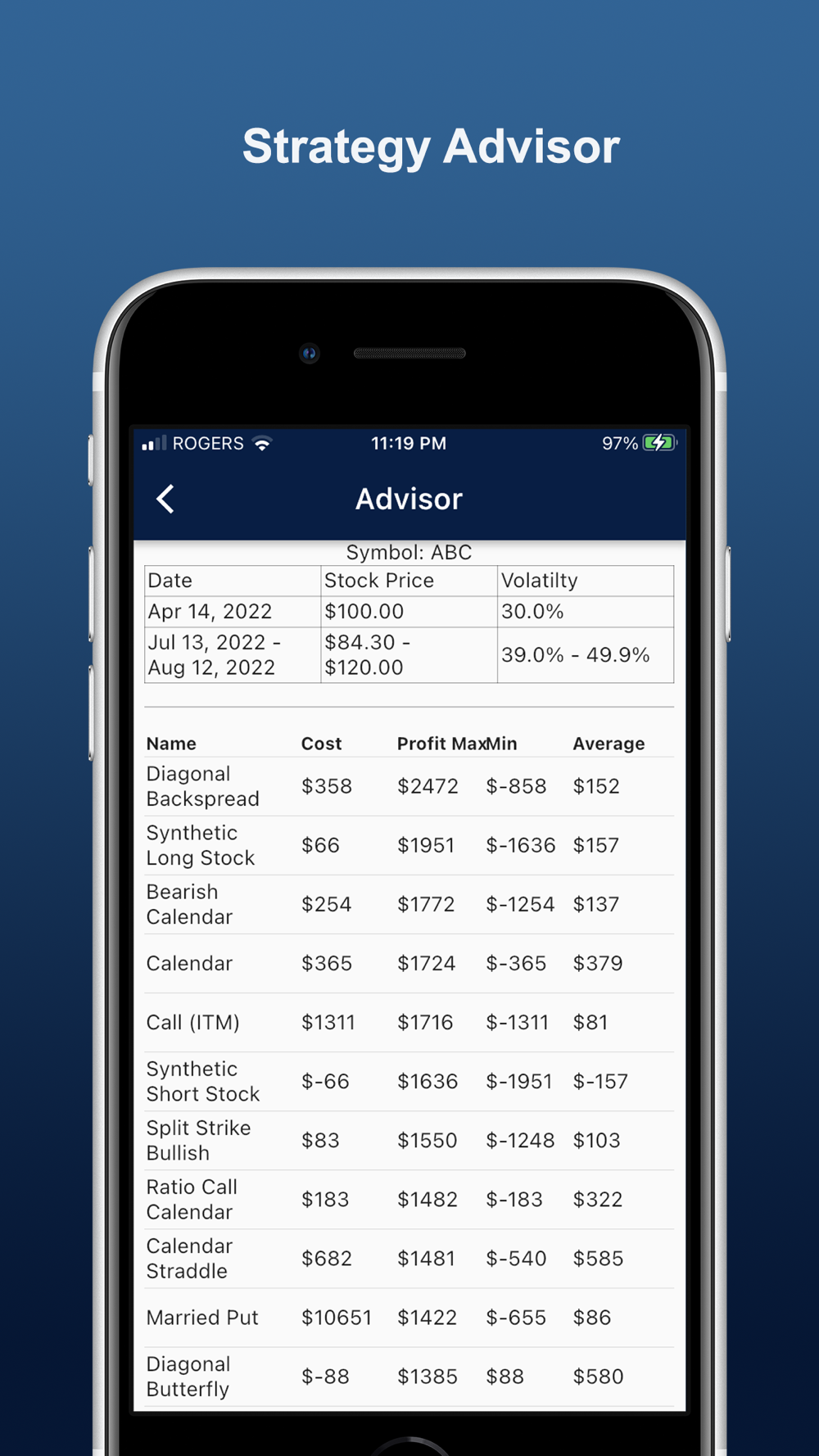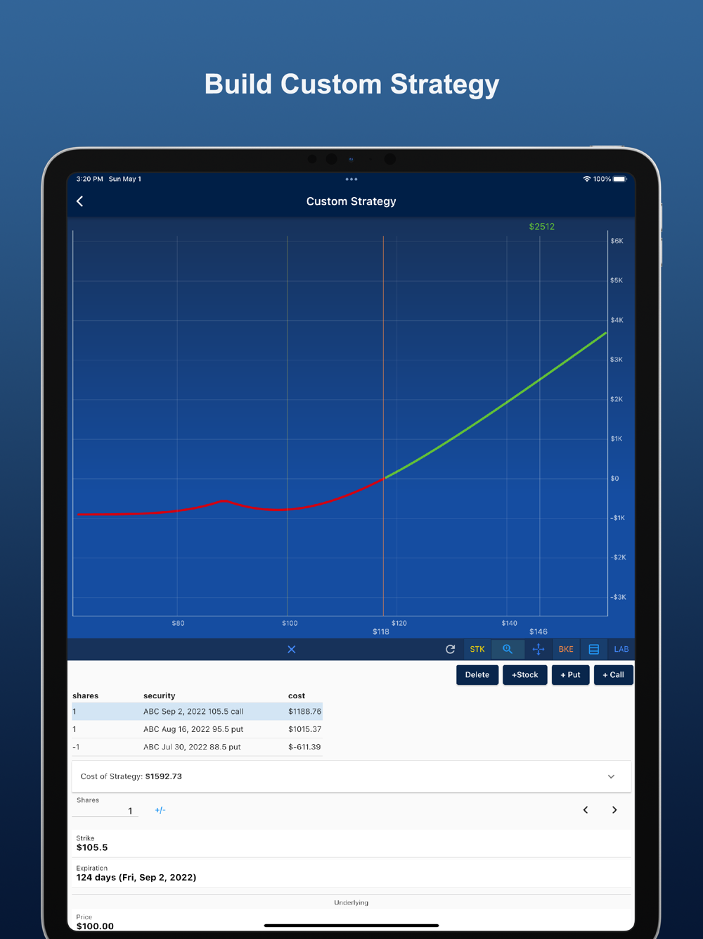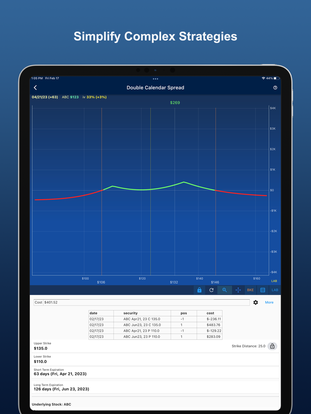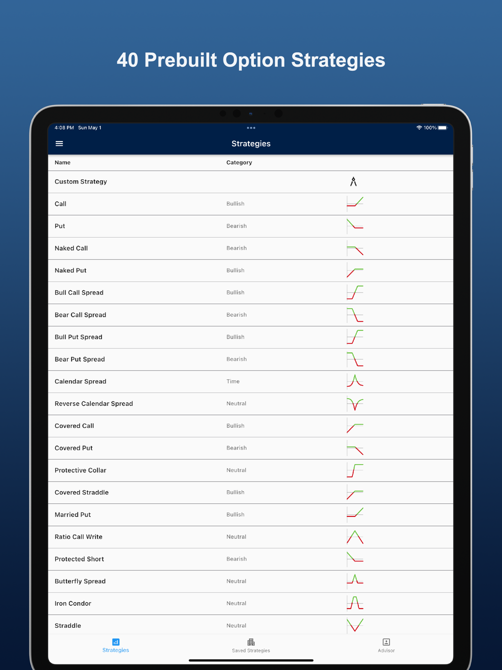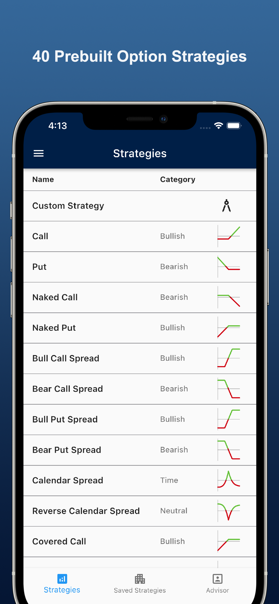 - 40 pre-defined Options strategies or build your own custom strategy.