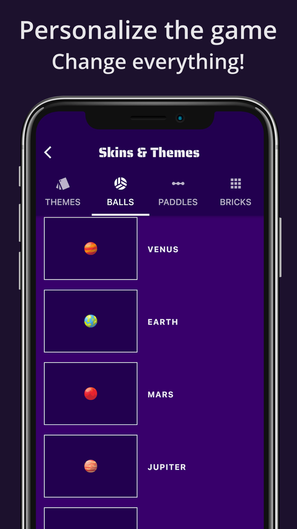 - 20+ themes and 50+ skins for balls, paddles and bricks. Design the game in your own way.