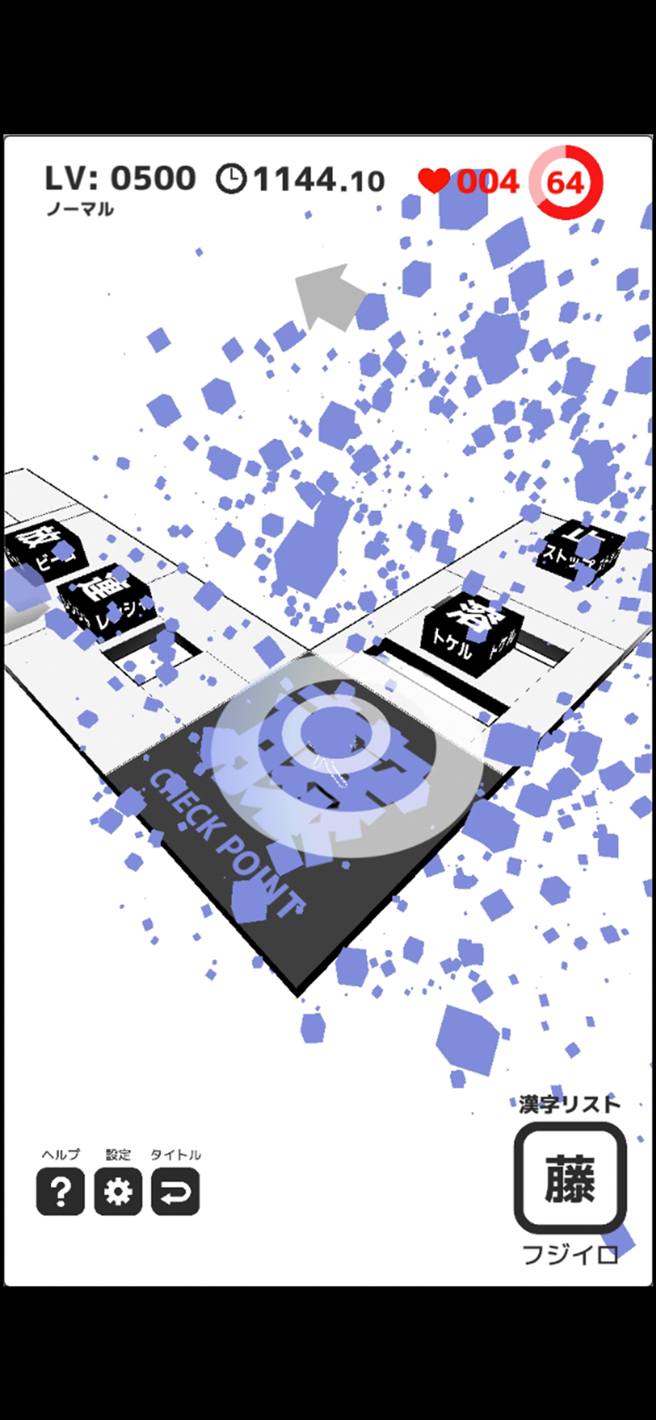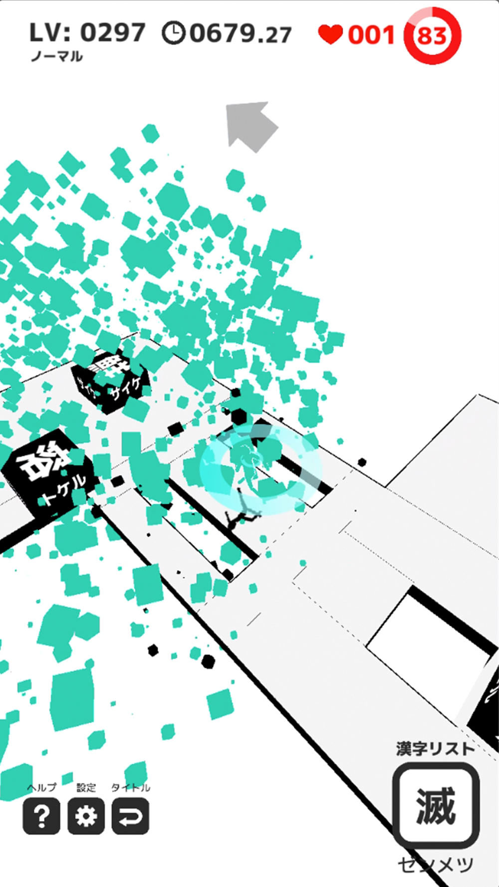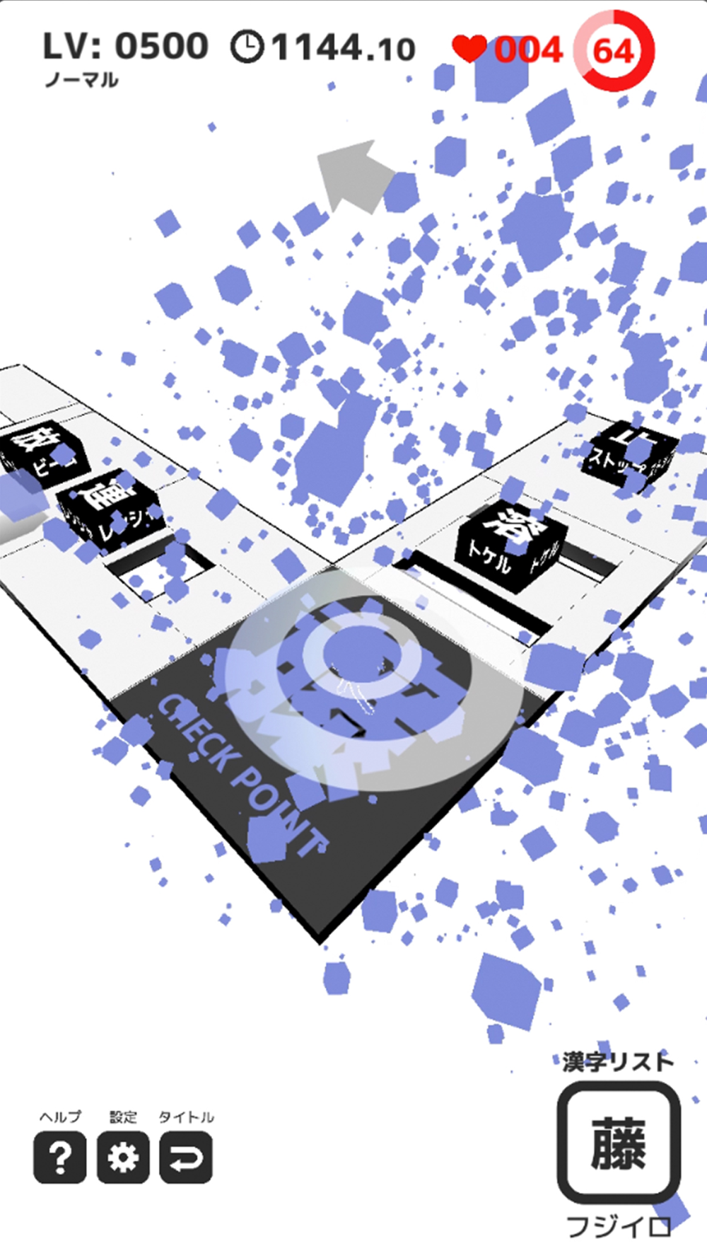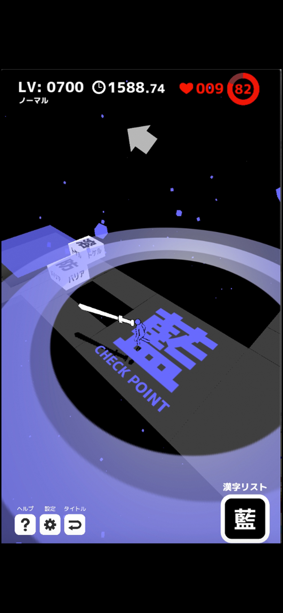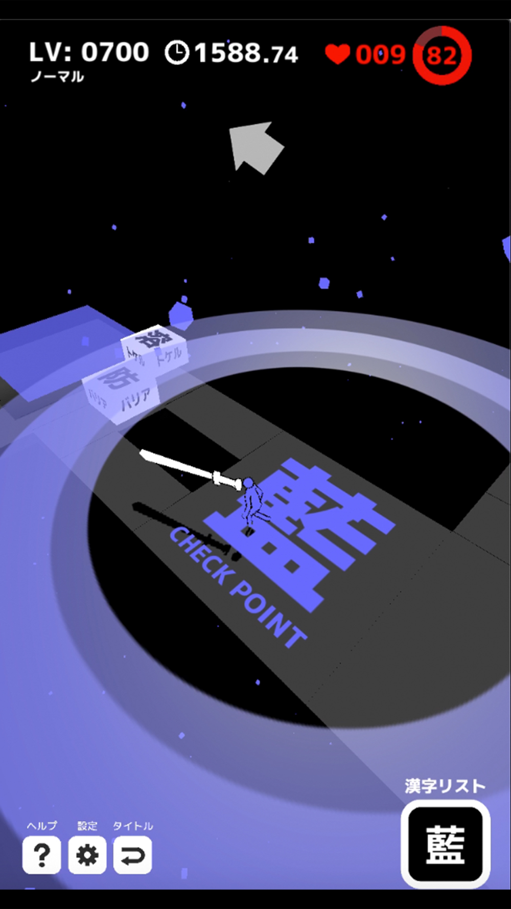 ステージ上のいたる場所に漢字が書かれた箱が配置されています。これらに触れると、その漢字に因んだイベントが発動します。それは「プレイヤー自身のアクション」「武器の出現」「視覚効果」「罠」など、プレイヤーにとって有利なもの、不利なもの様々です。これらの『漢字』をうまく障害物を使ってゴールを目指しましょう。