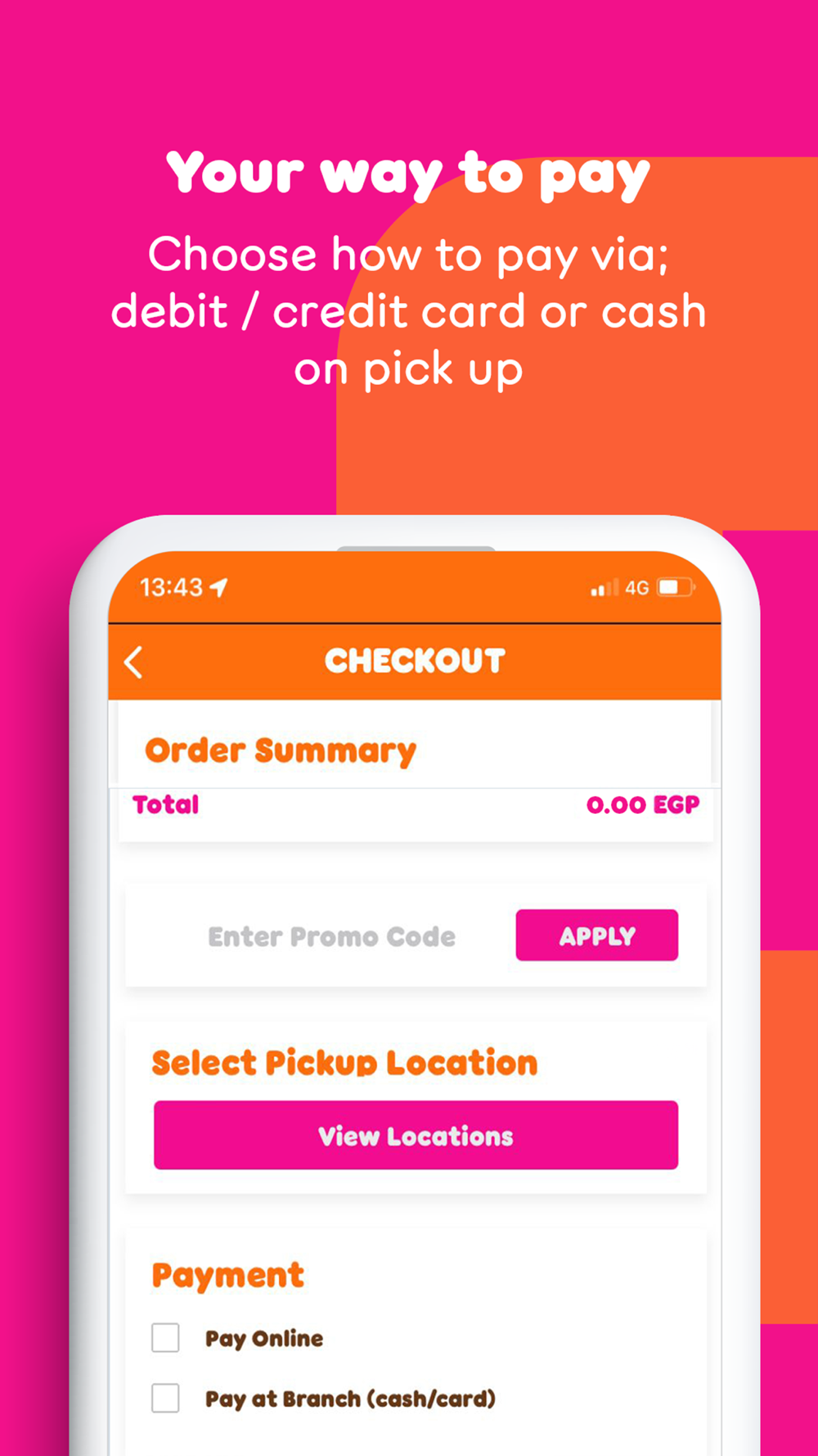 Join the My Dunkin’ Rewards to earn points for every EGP you spend and be rewarded. You can use your points to redeem a selection of our products.