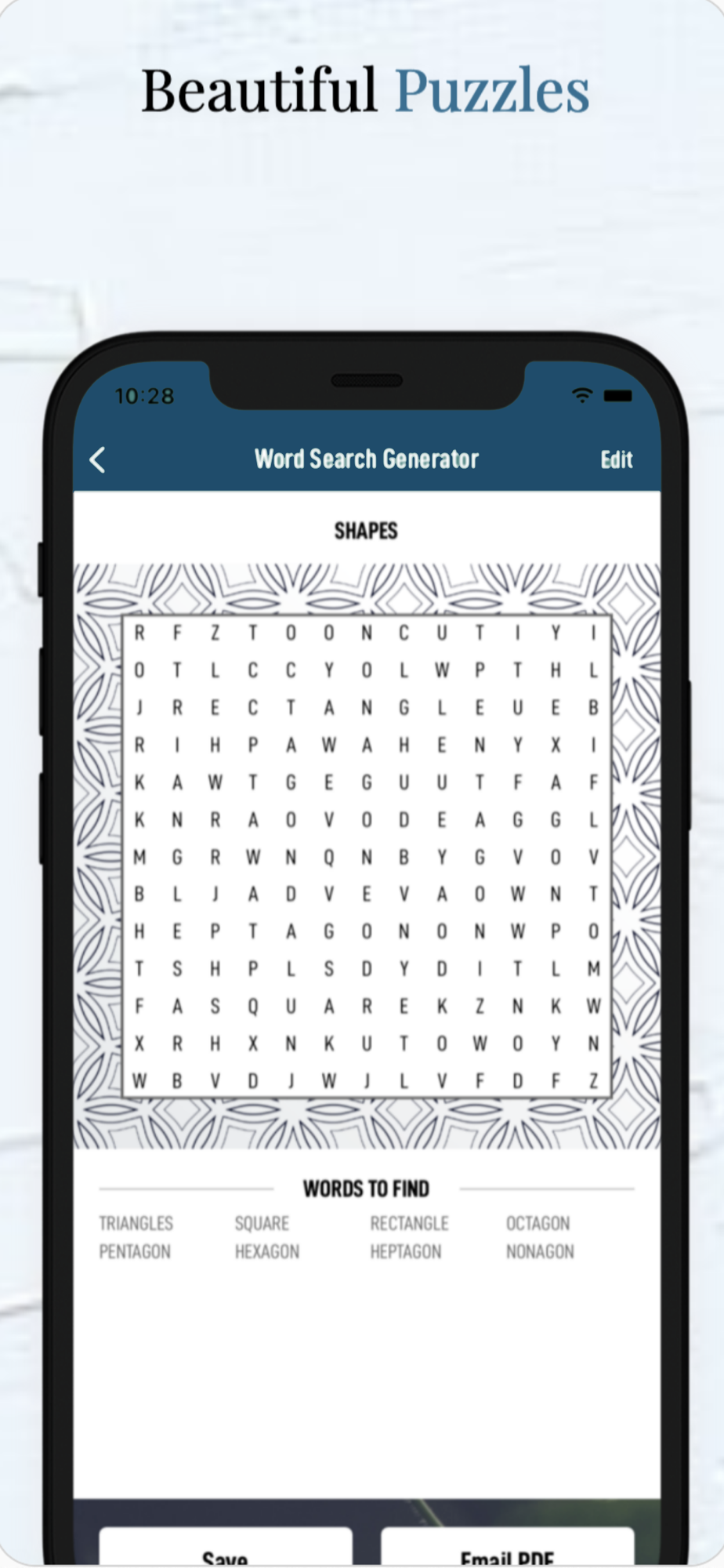 The WordSearch Generator has an easy to use interface, highly intuitive. The app allows you to create beautifully designed and custom made Word Search Puzzles which can be saved on your device and can be edited on a different date to be adapted for a new audience.