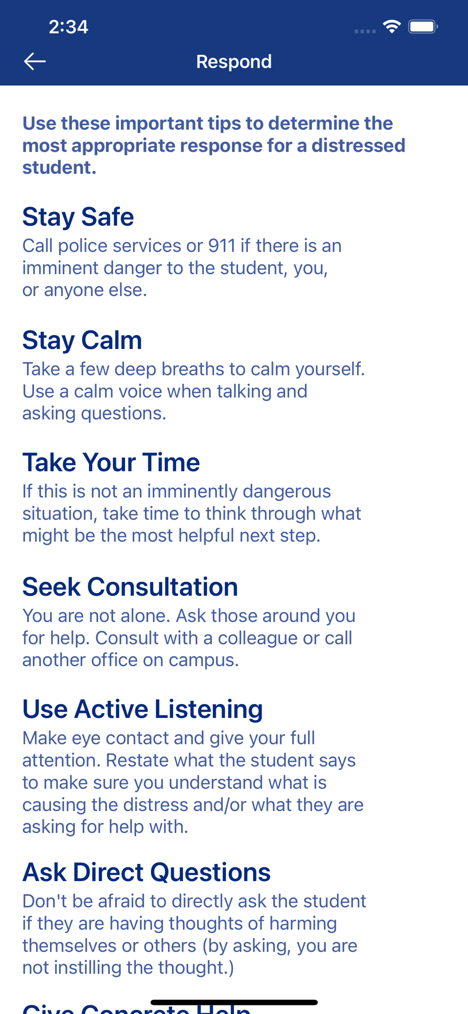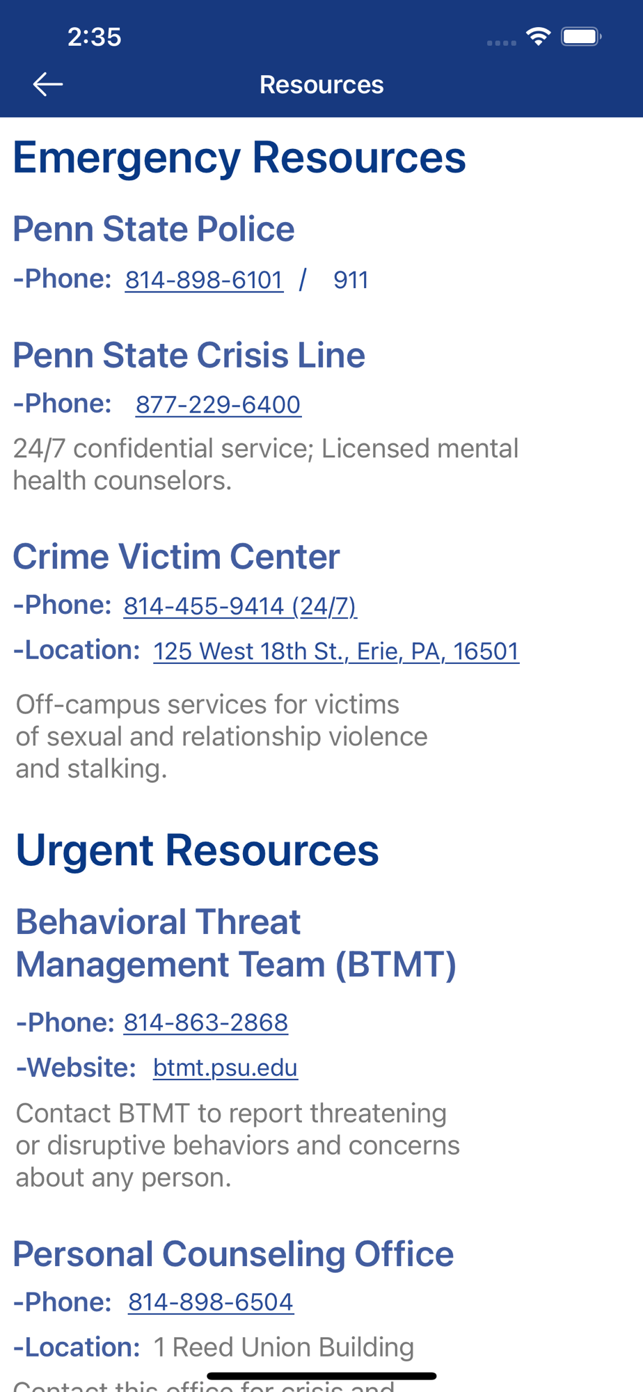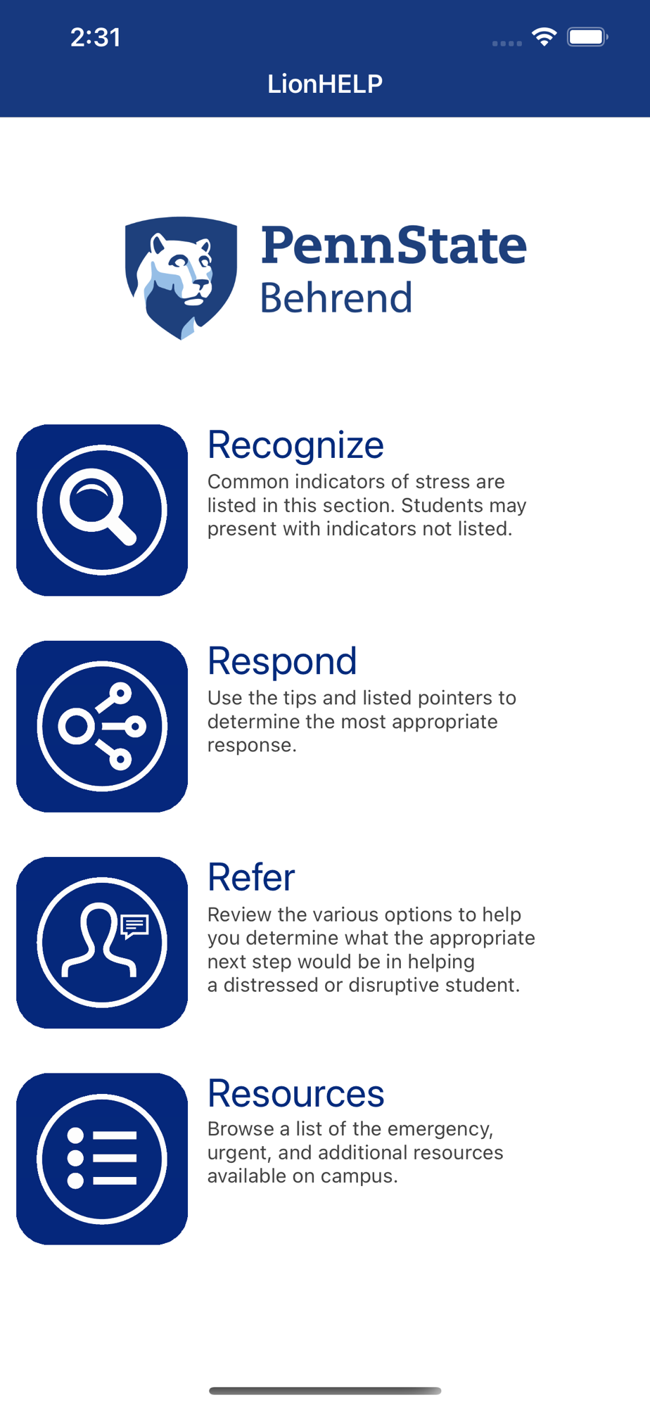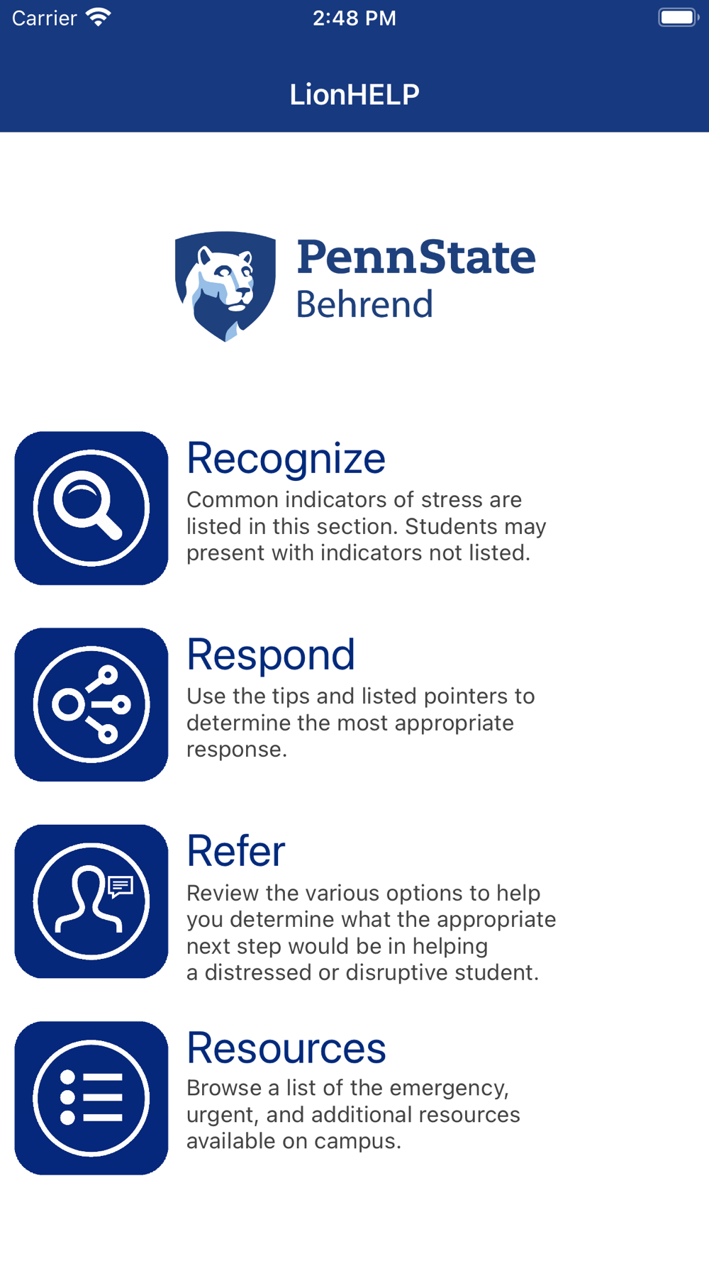 LionHELP for Penn State Behrend is a quick reference guide for recognizing, responding to, and referring distressed students at Penn State Behrend. This app is NOT meant to be a diagnostic tool nor is it meant to serve as a substitute to getting help from a licensed professional.