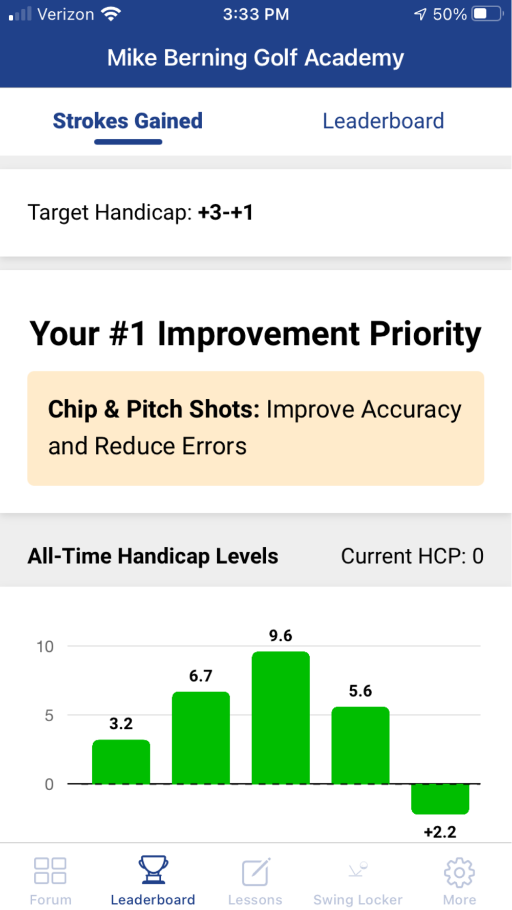 Performance Tracking: students that use the SwingU GPS & Scorecard app on the course can have Mike and his team track their scorecards, stats, and progress on the course