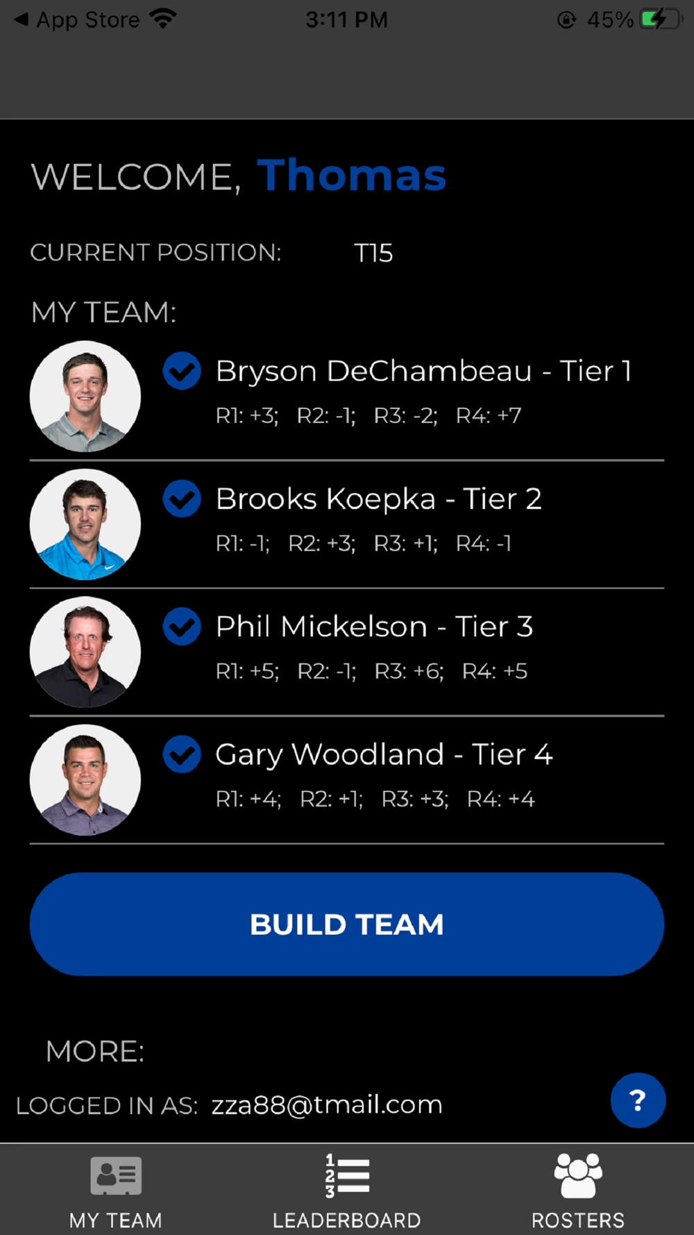 Our app provides a glimpse into additional stats and information. See golfers' scores, the perfect team, and keep track of your opponents on the leaderboard.