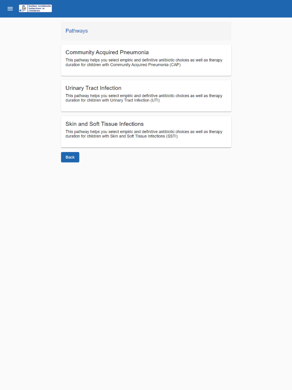 This tool is designed to help you make decisions about what antibiotics to use and for how long when treating children with community acquired pneumonia, skin and soft tissue, or urinary tract infections. Information is designed to align with the project metrics for the American Academy of Pediatrics Value in Inpatient Pediatrics (VIP) Network Better Antibiotic Selection in Children (BASiC) Project.