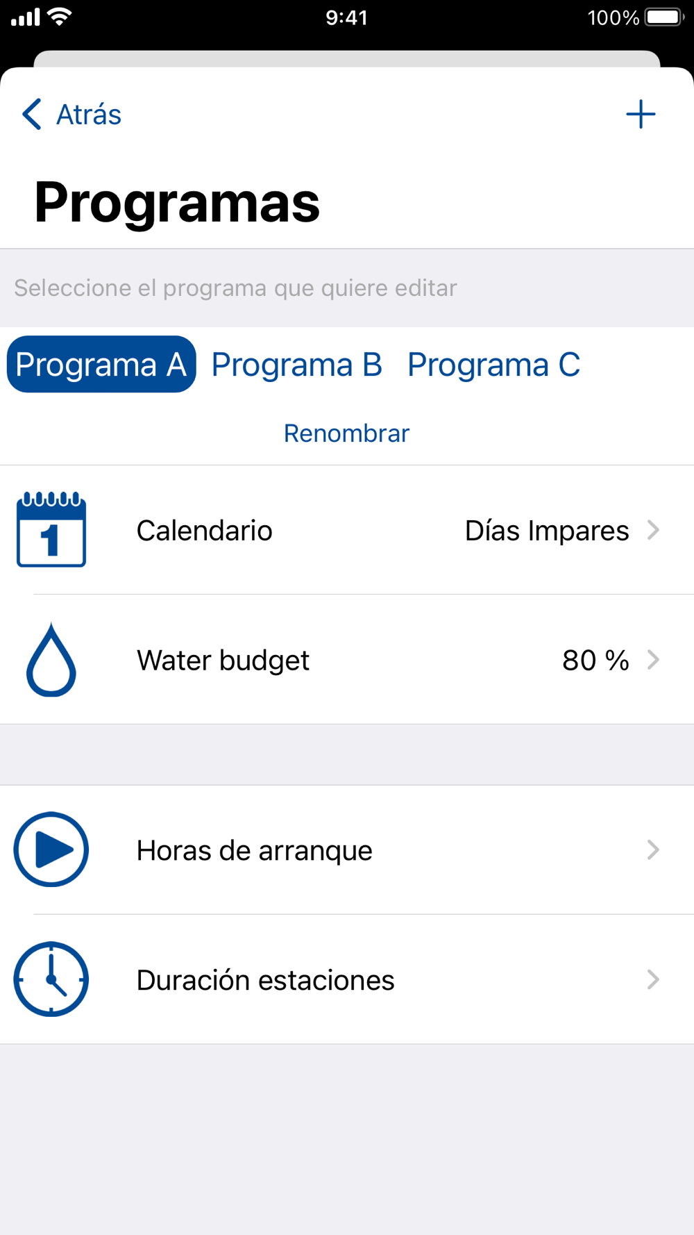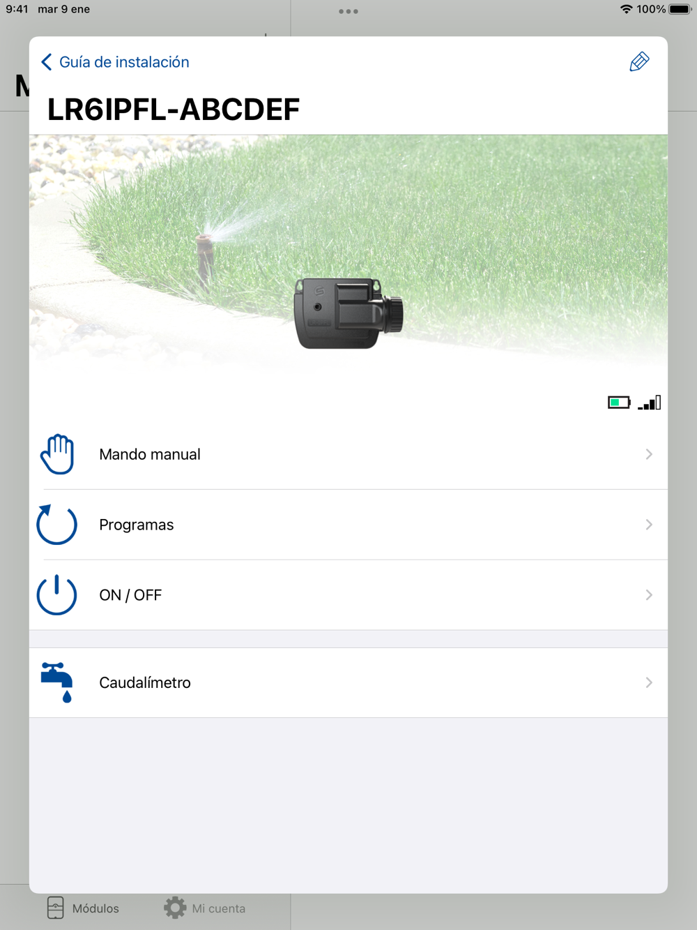 La aplicación permite la configuración y operación de diferentes sistemas de riego, así como el control de actuadores, programadores y sensores de humedad.