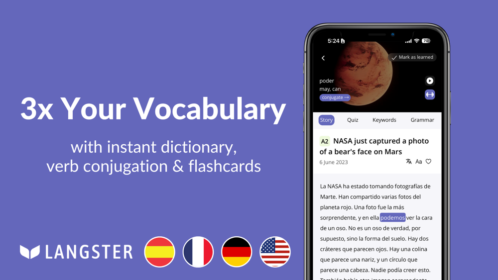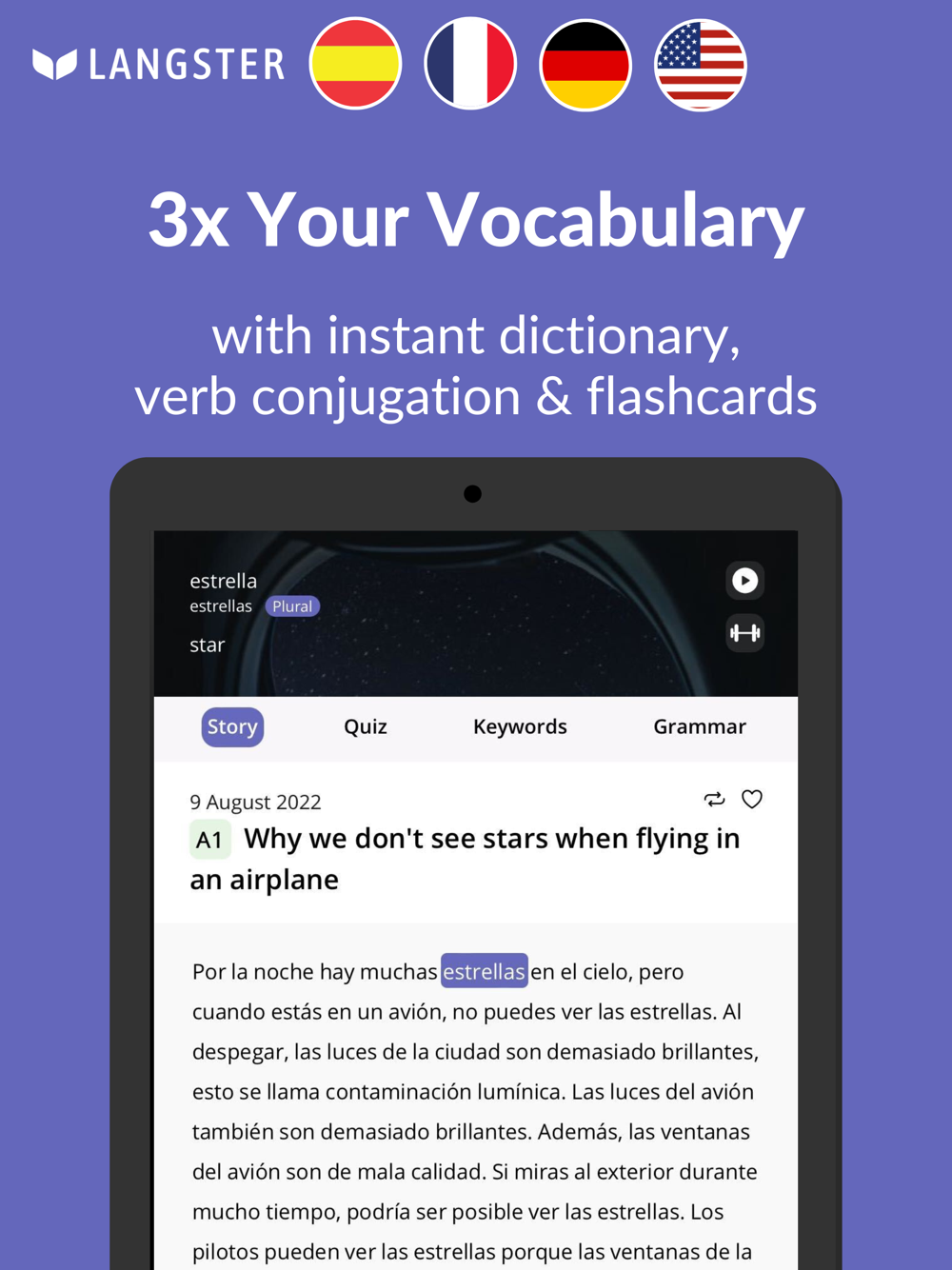 Langster is a language learning app with real-life news & stories from A1-B2 levels. We are the world's first CEFR-graded reader to help you learn French, German, Spanish, and English. Read and listen to news & stories anytime, anywhere – take 5 minutes a day to learn a foreign language!