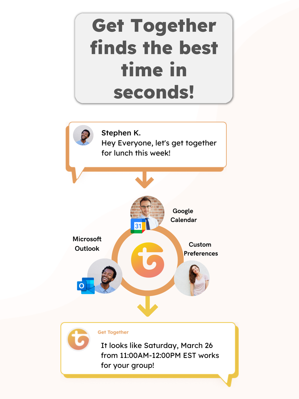 With first-of-its-kind scheduling technology, Get Together makes finding time with family, friends and colleagues simpler than ever by identifying the best time for everyone within seconds.