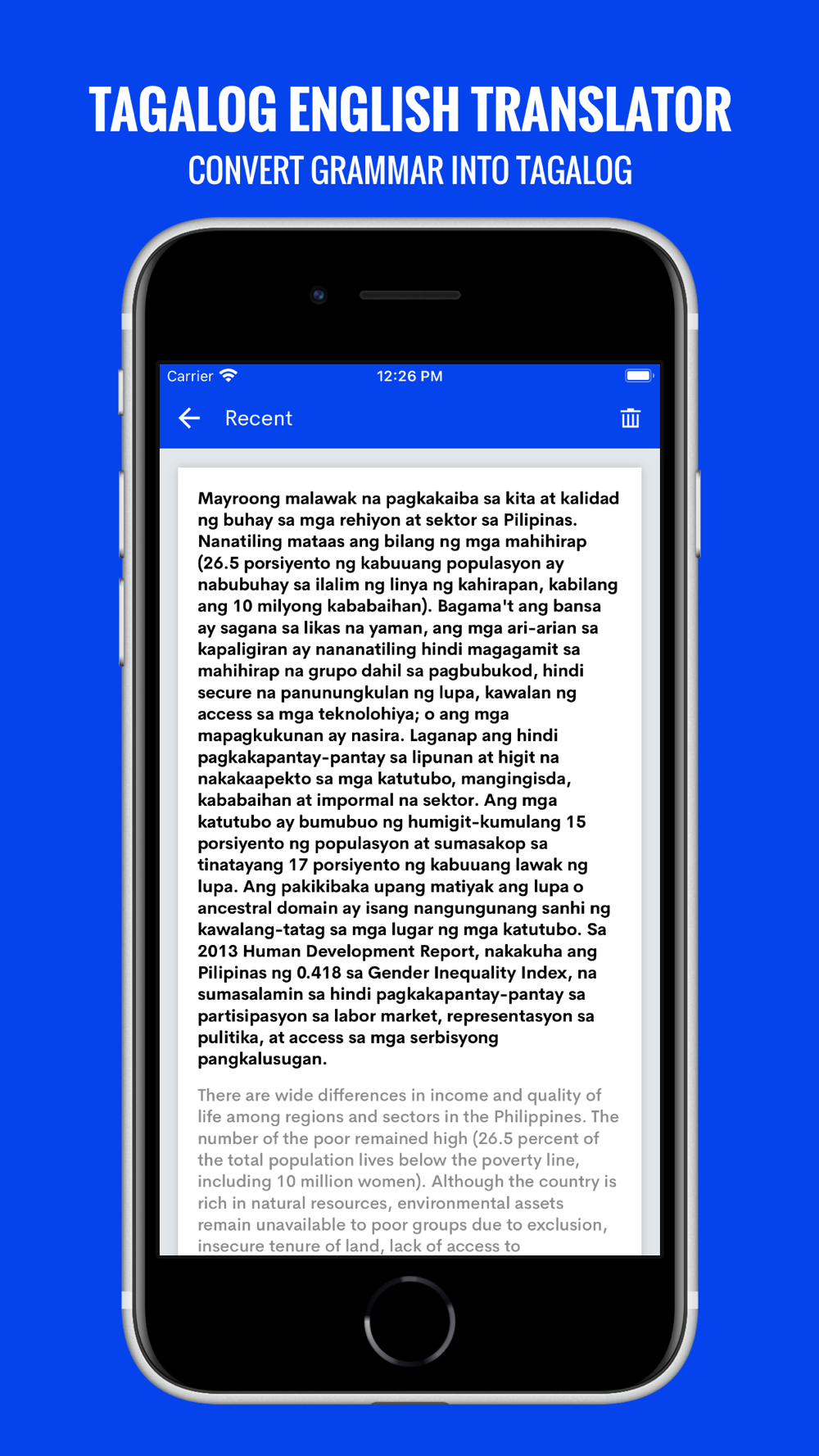 This free app is able to translate words and text from Tagalog to English, and from English to Tagalog.Best app for easy and fast translations, which can be used like a dictionary. If you are a student, tourist, or traveler, it will help you to learn the language!