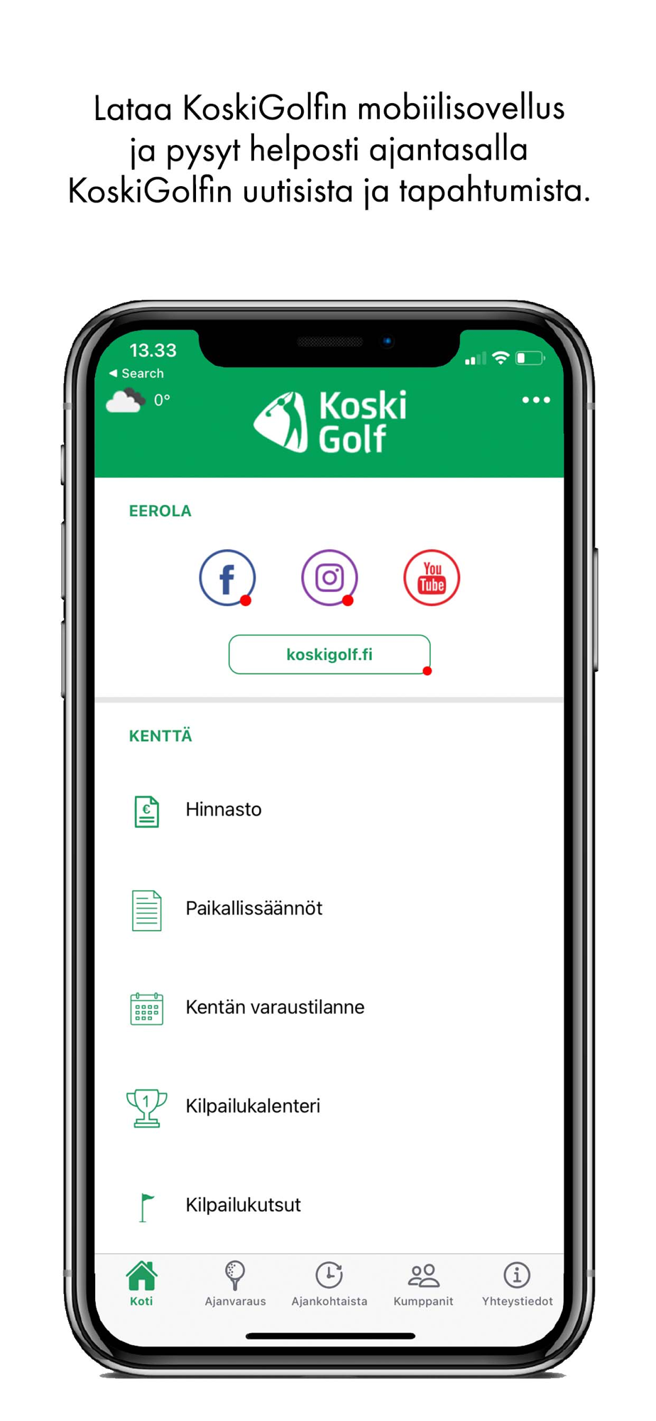 Sovelluksella voit varata lähtöaikoja ja seurata KoskiGolfin ja sen oheistoimijoiden tiedotteita.