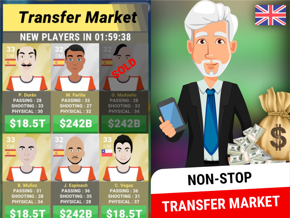 Assemble the ultimate squad of football superstars! Scout and transfer the best players from all over the globe to strengthen your lineup. Select top talents from football powerhouses like England, Spain, Germany, Italy, USA, and beyond. Develop your team's chemistry by choosing the right tactics and formations. Lead your dream team to victory and claim the coveted trophies of the football world!