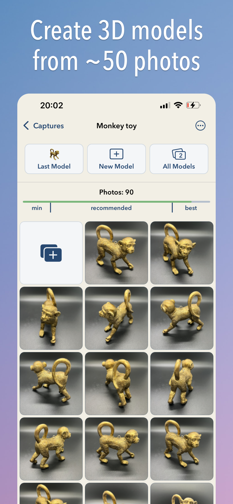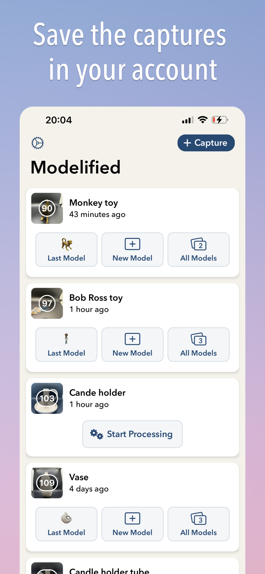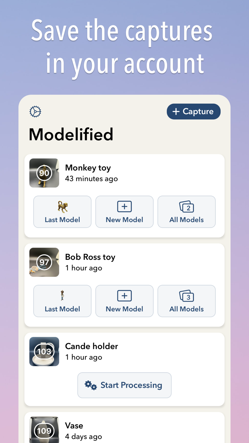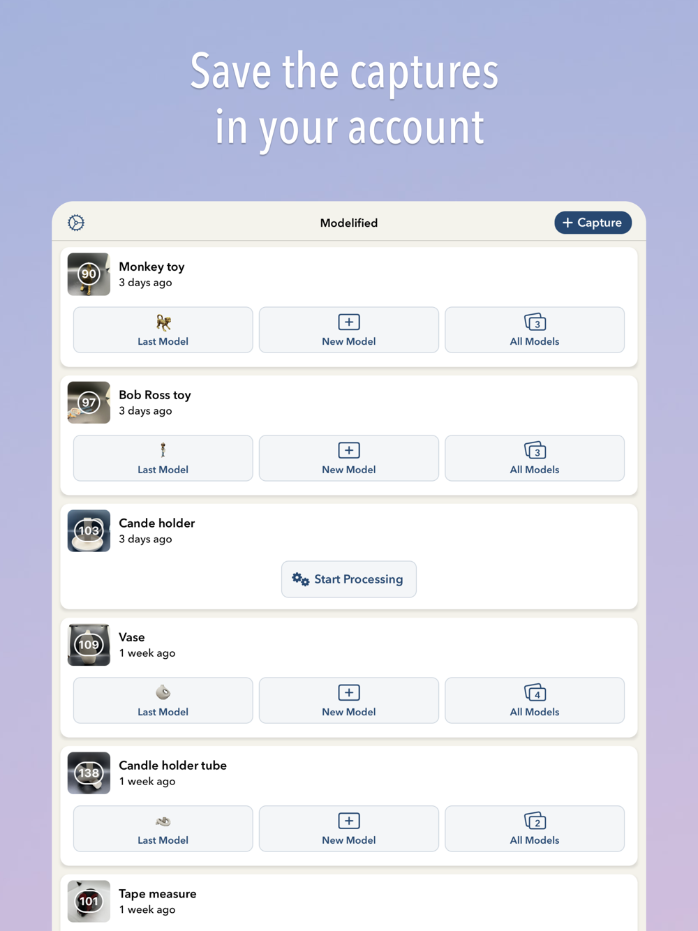 Using Apple's latest advanced Photogrammetry APIs, Modelified allows you to quickly create high-quality 3D models by simply taking photos of your object from all sides.