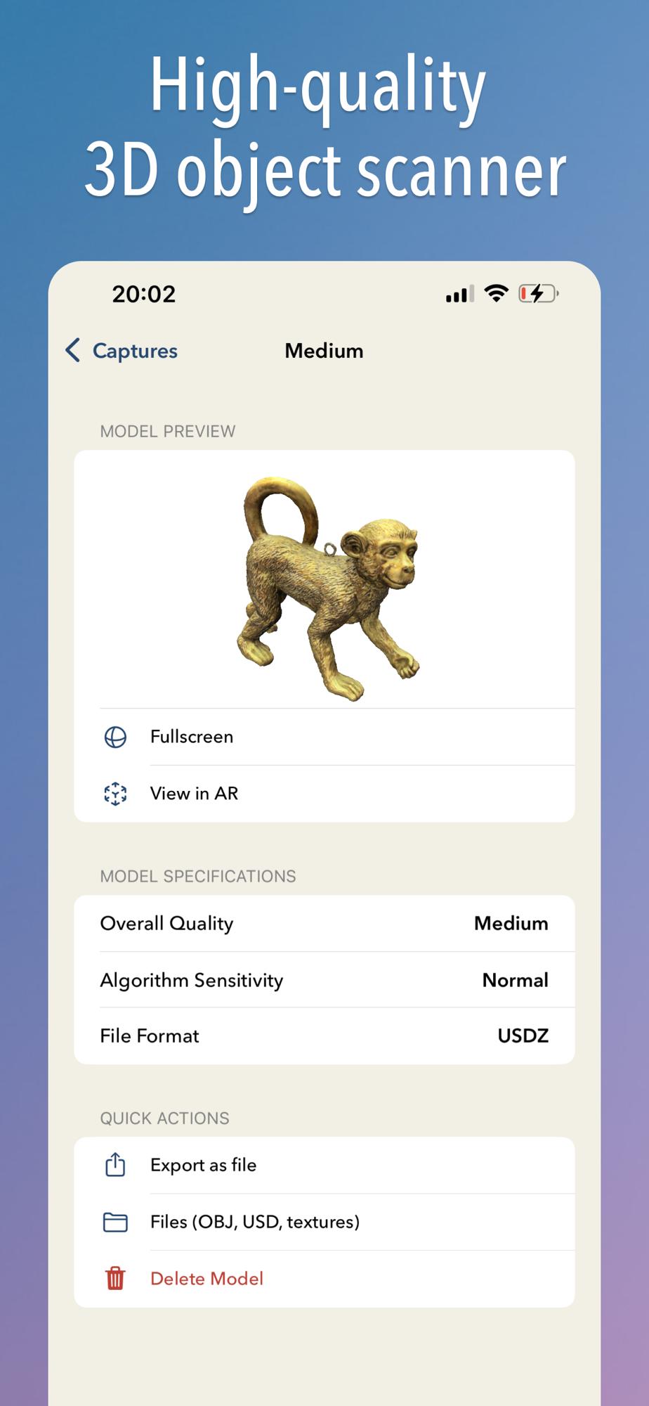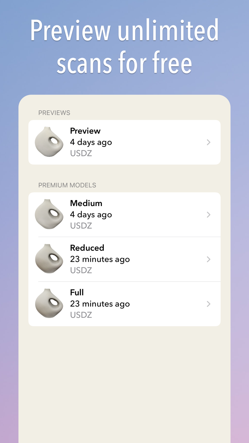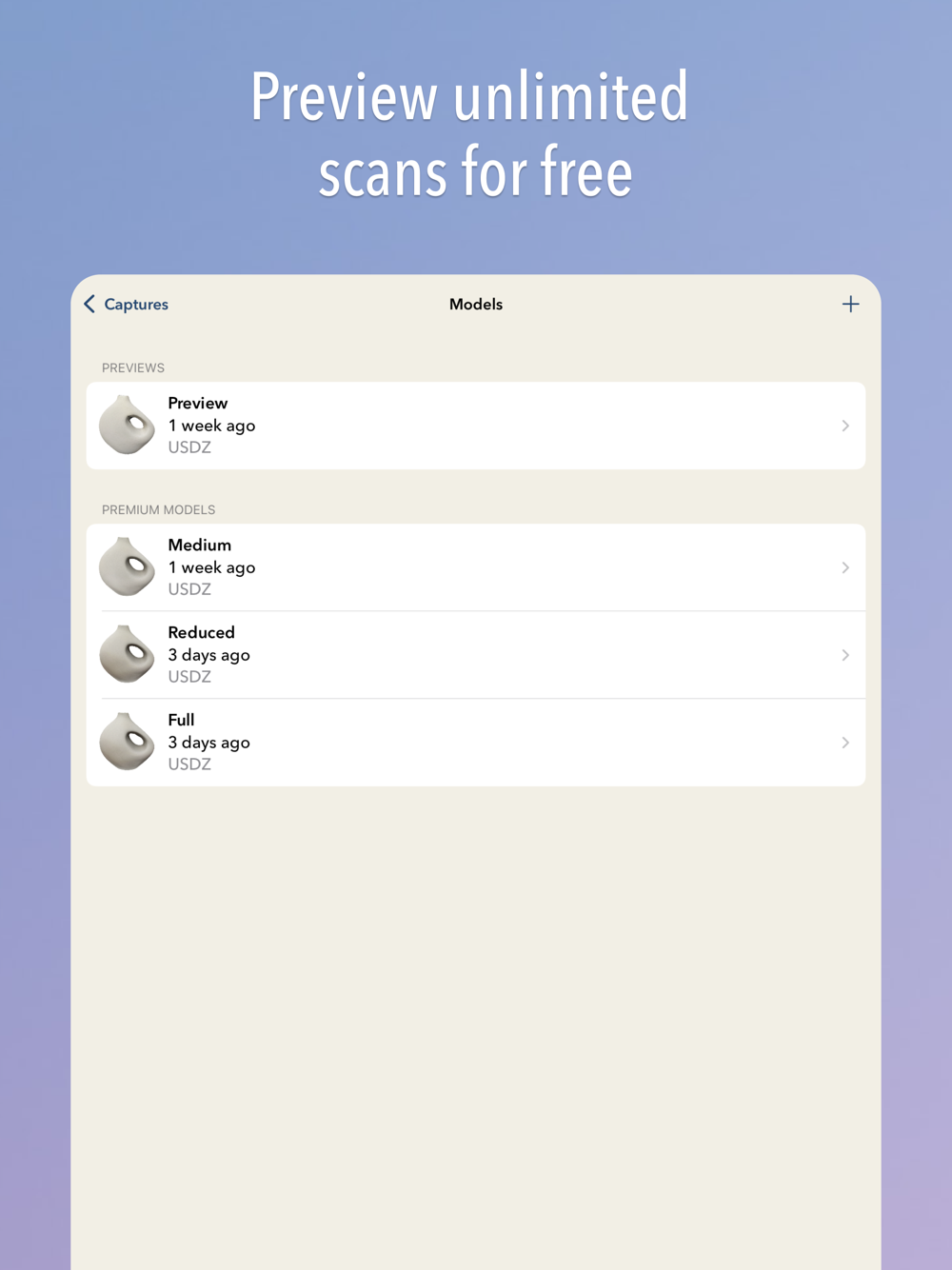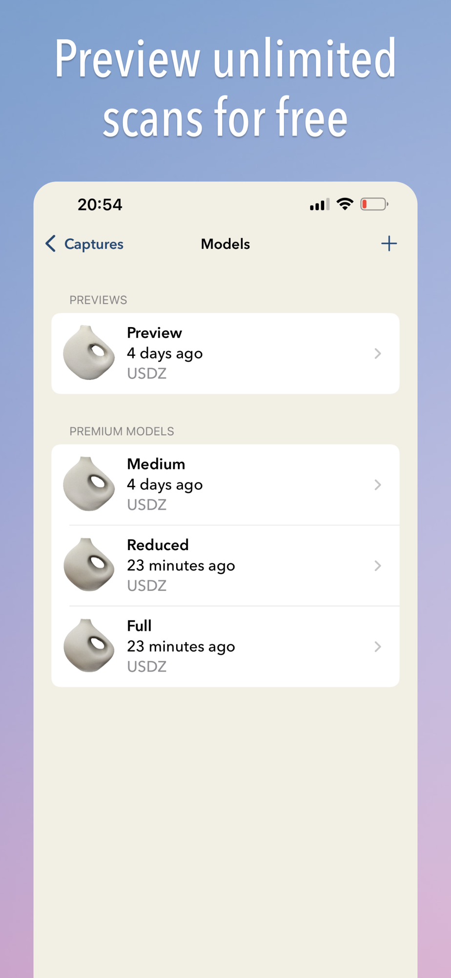 In order to create a 3D model in a higher production-ready quality, you have to unlock each capture for a small fee or subscribe to one of Modelified PRO plans.
