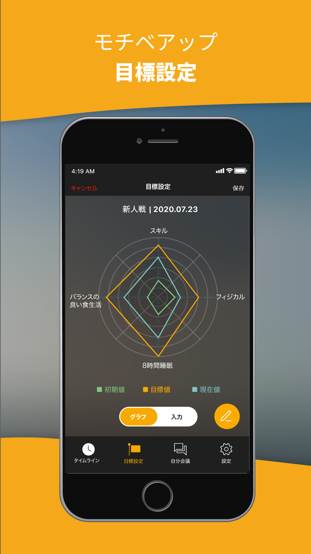 主な機能は、タイムライン、目標設定、自分会議があります。