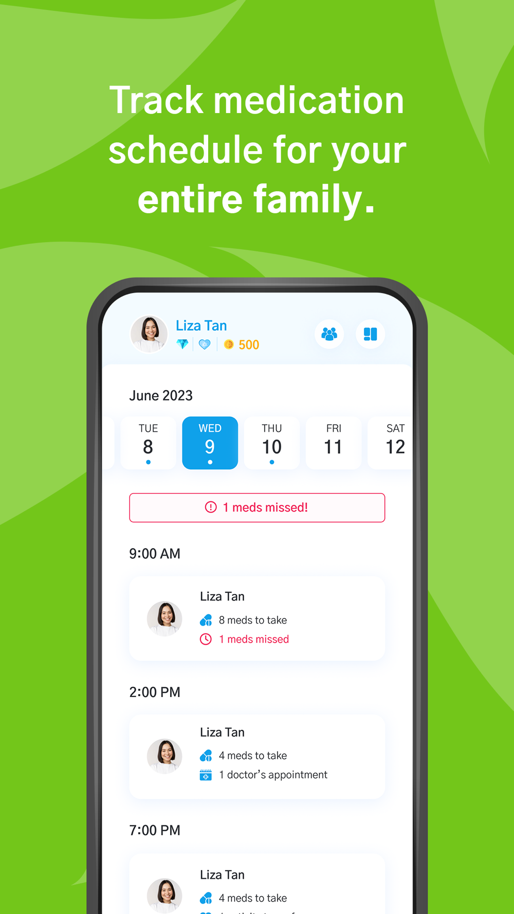• Add dependents to manage their medication and friends for a reminder when you miss a dose.