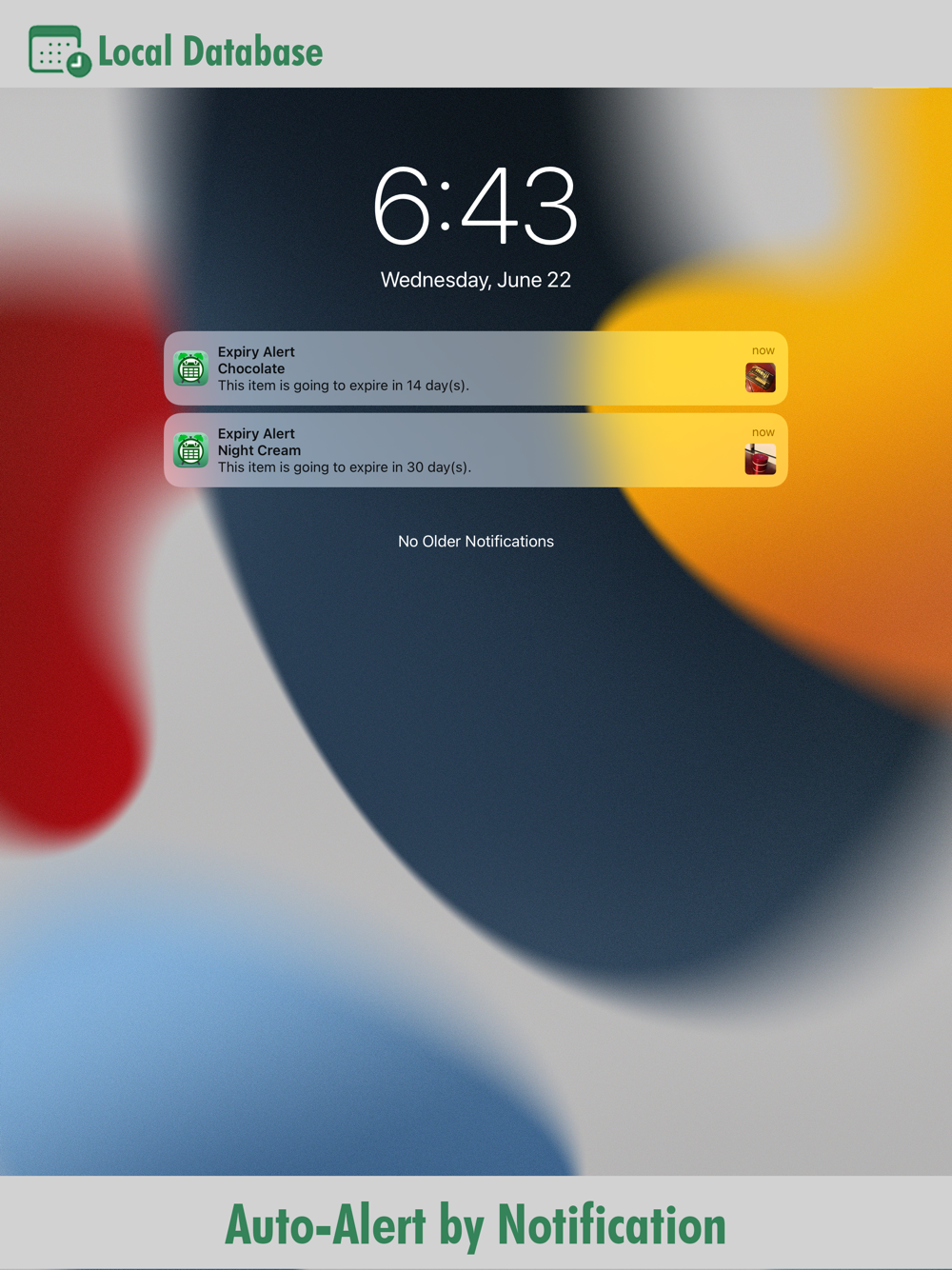 Local Database - Keep track of your items' (e.g. food, drink, coupon) expiry date by categories. Setup 3 alert at designated time before the item expires. Get rid of wastage due to unaware expired items.